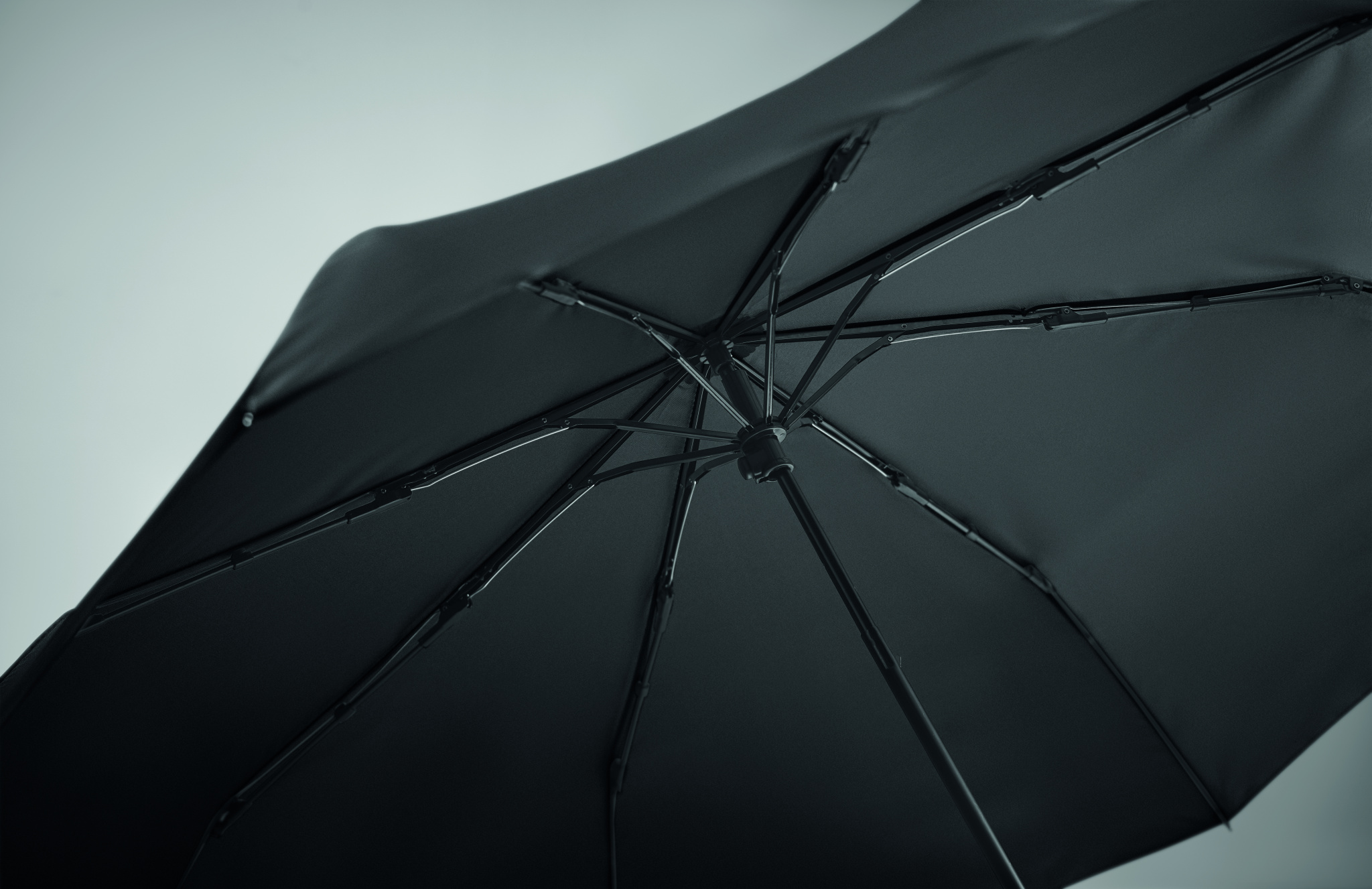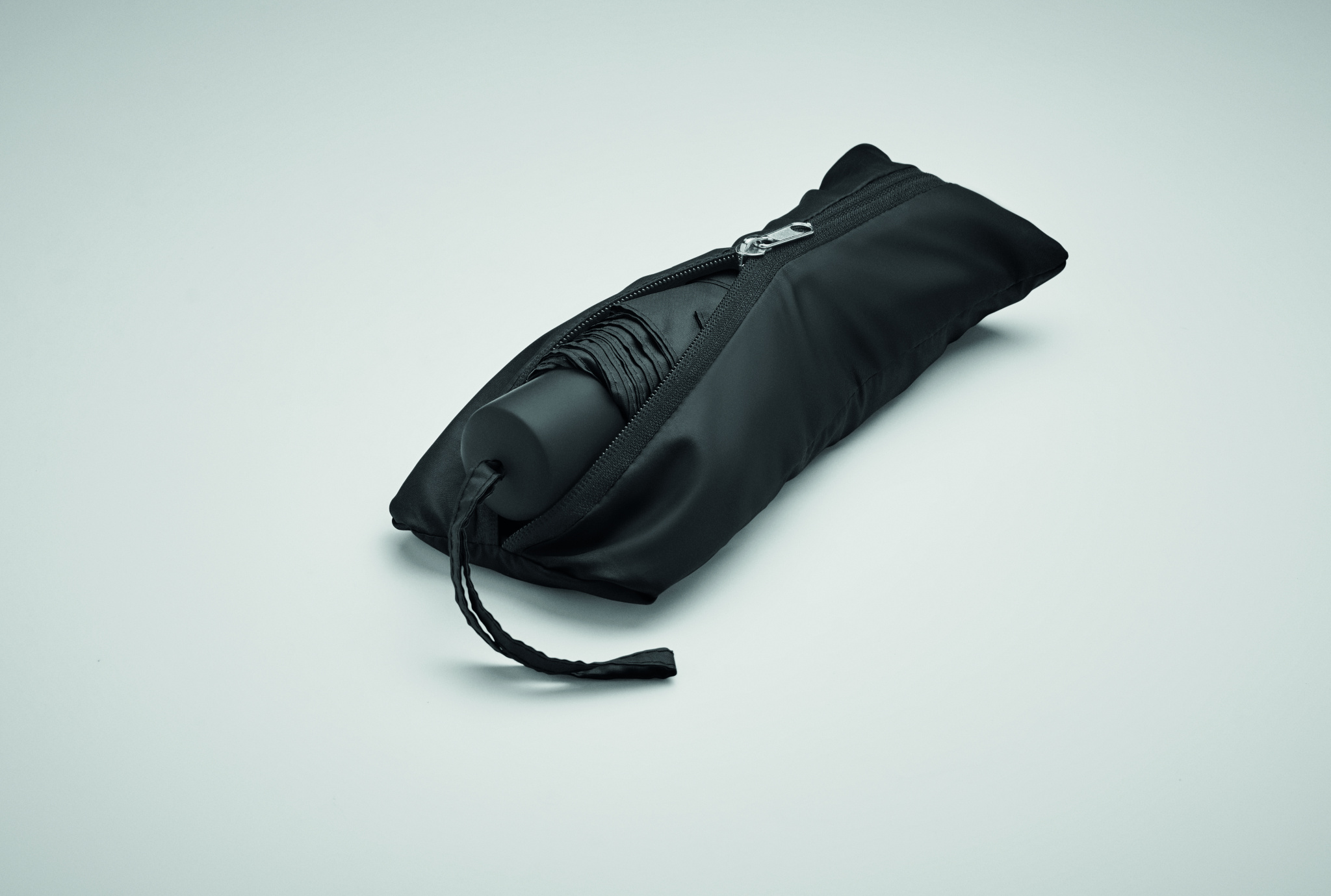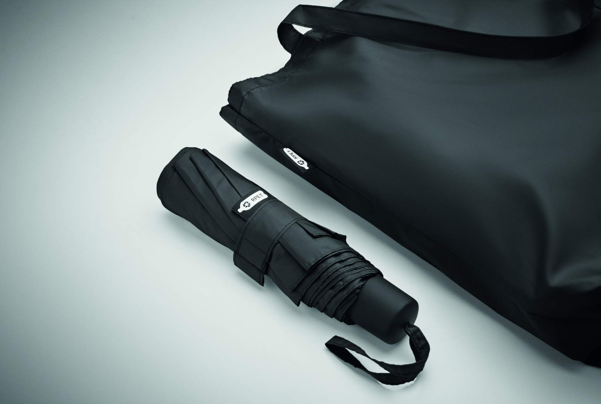 21'' Regenschirm aus 190T RPET-Pongee. 3fach gefaltet. Windbeständig. Manuelle Öffnung und Schließung. Inkl. Tragetasche mit Reißverschlussfach. Bei Nichtgebrauch der Tasche wird sie zusammengerollt und das Reißverschlussfach dient als Schirmhülle.