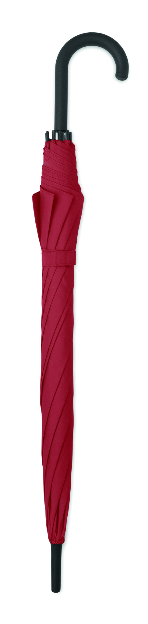 23'' Regenschirm aus 190T Pongee. Stock aus schwarz überzogenem Metall und Stangen aus Fiberglas. Krone und Spitzen aus Kunststoff. Gebogener Griff aus gummiertem PP. Automatische Öffnung, manuelle Schließung.