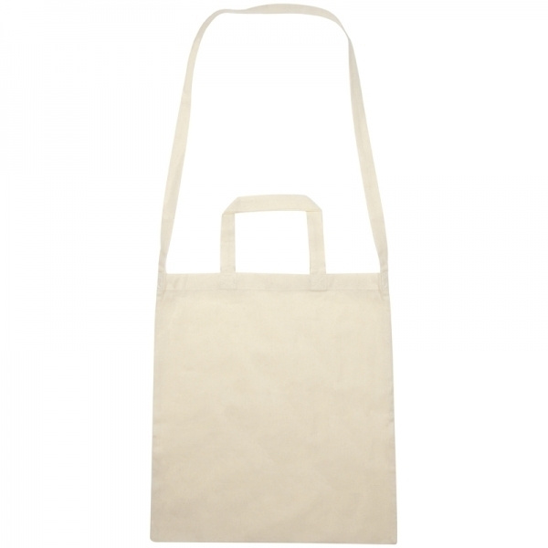 Naturfarbene, umweltfreundliche Baumwolltasche mit zwei kurzen Henkeln und einem langen Tragegurt. Ihr Logo drucken wir einseitig auf.