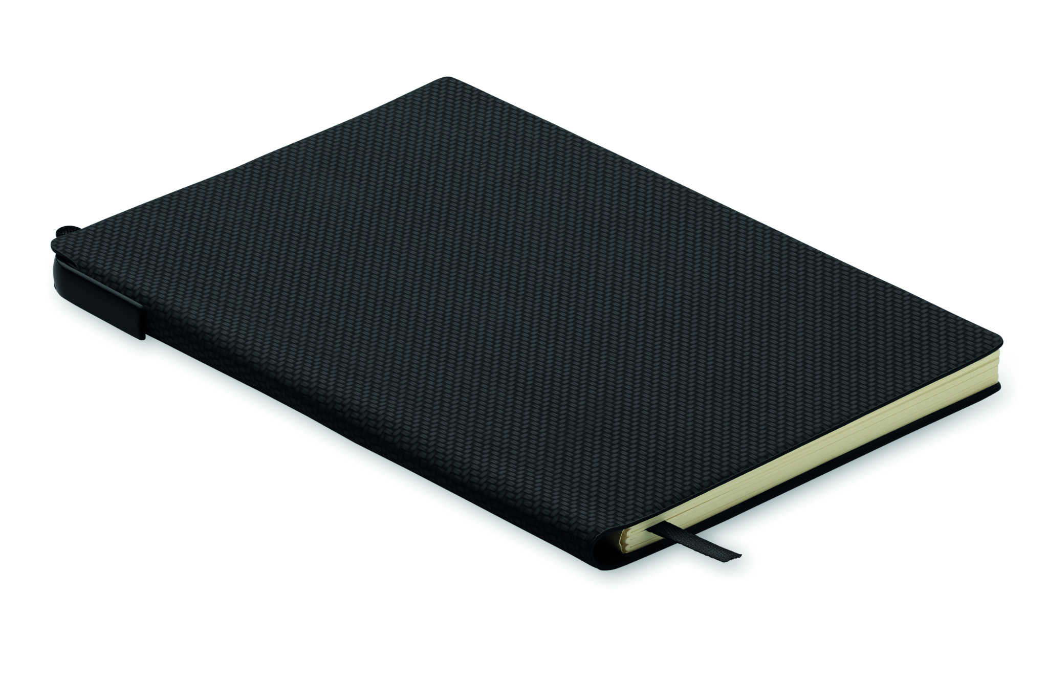 DIN A5 Notizbuch mit gebundenem, strukturiertem Einband aus PU. Drehkugelschreiber aus ABS und Stifthalter im Buchrücken. 80 Blatt (160 Seiten) liniertes Recyclingpapier.