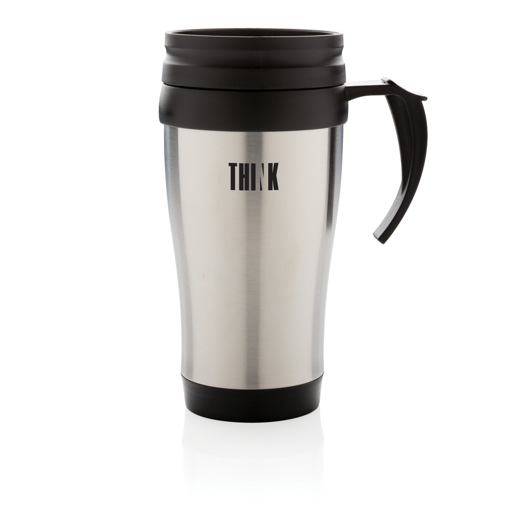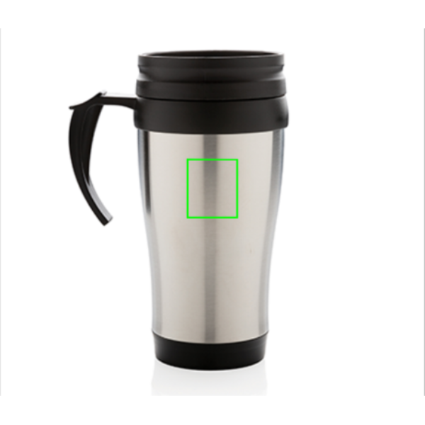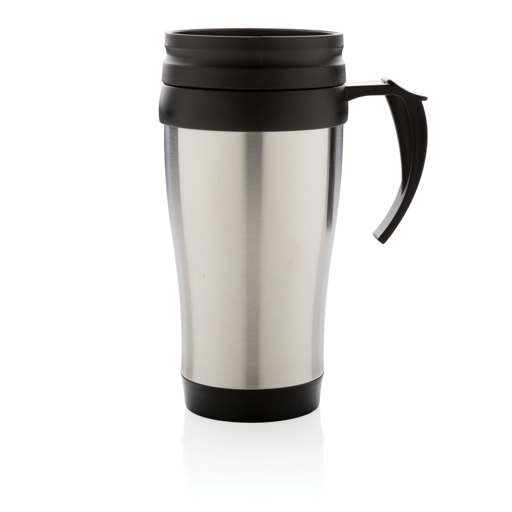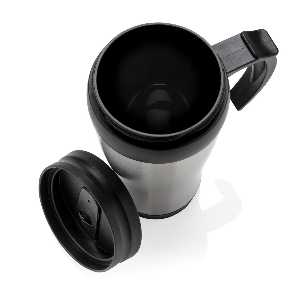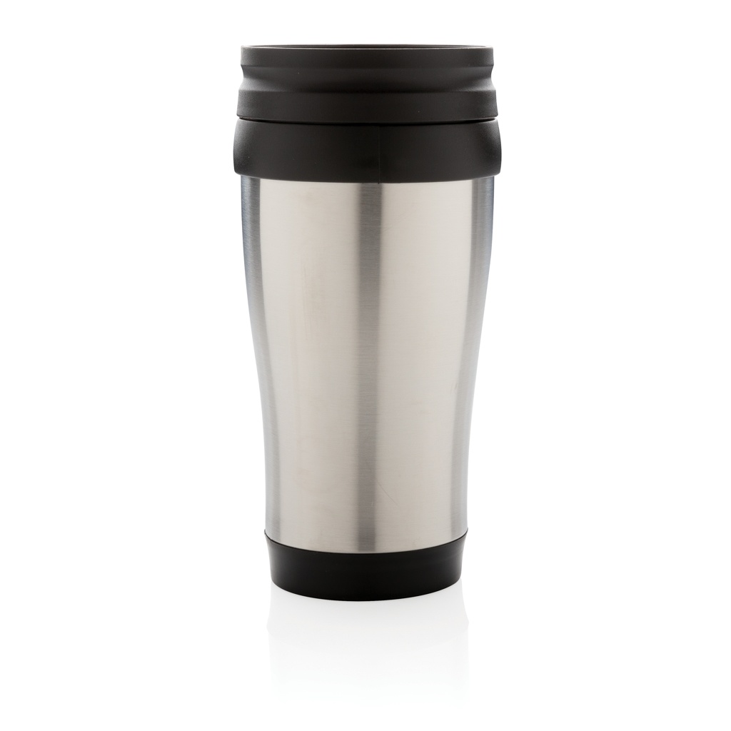 350ml Edelstahltasse, innen mit Kunststoff ausgekleidet, Deckel mit Schiebeöffnung. Nur Handwäsche.