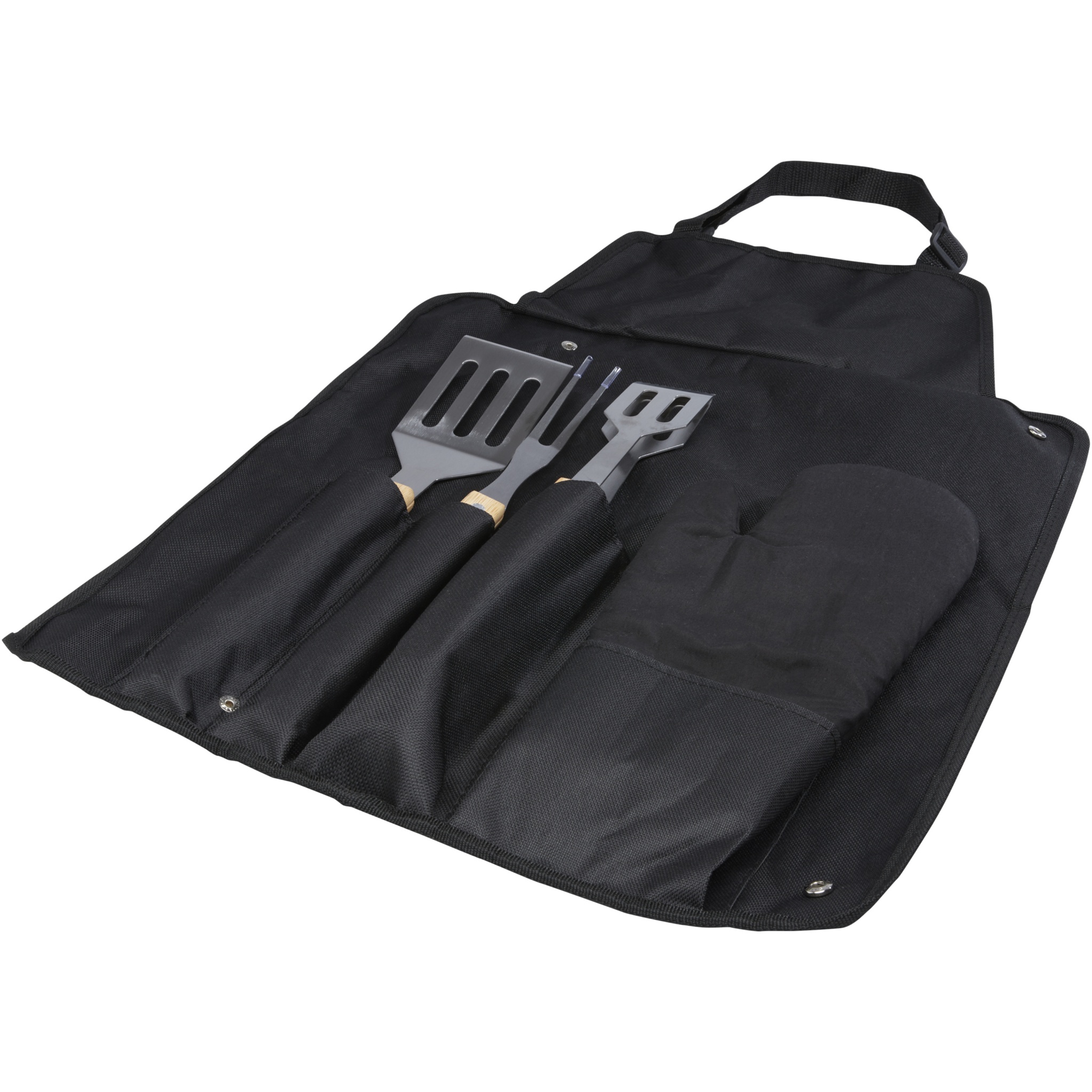 5-teiliges BBQ-Set mit Wender (36,5 x 7 cm), Gabel (36,5 x 2 cm), Zange (36,5 x 5 cm), Handschuh (25 x 16 cm) und einer Schürze mit Tasche (42 x 60 cm). Die Handgriffe sind aus Bambus, der nach nachhaltigen Standards bezogen und produziert wird.