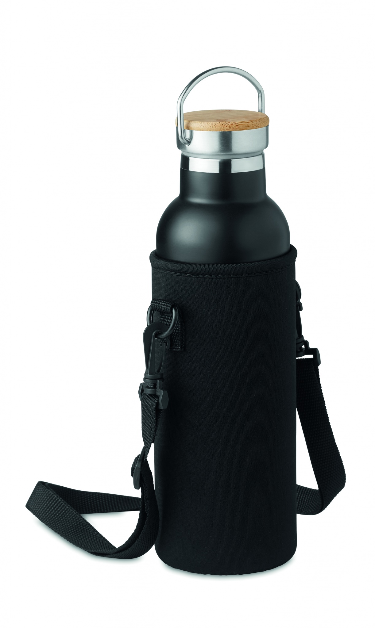 Doppelwandige Isolierflasche aus Edelstahl. Auslaufsicherer Schraubverschluss und separater auswechselbarer Deckel mit Mundstück. Inkl. Tragetasche aus Neopren. Füllmenge: 700 ml.