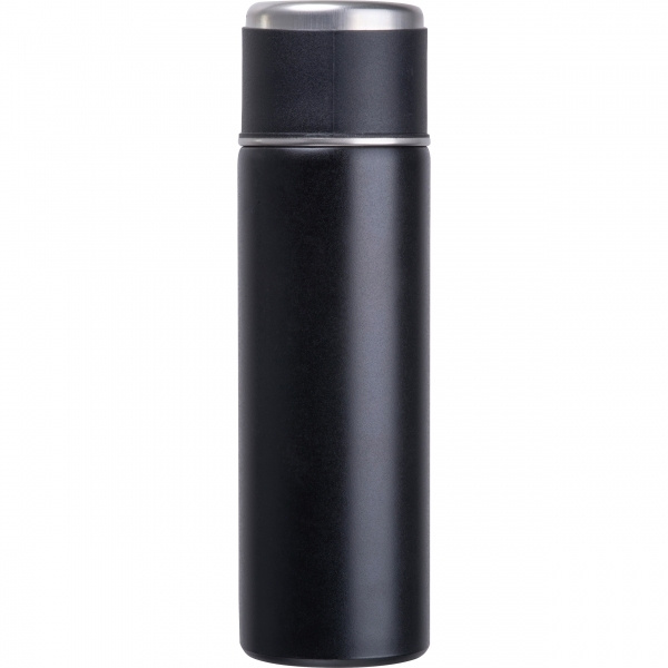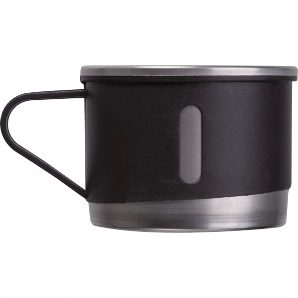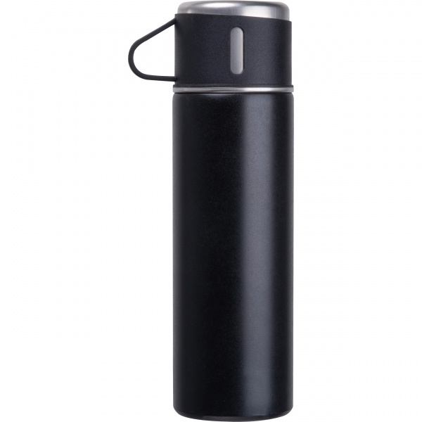 Isolierflaschen-Set bestehend aus einer doppelwandigen Edelstahl-Isolierflasche (400 ml) mit Schnellverschluss und drei Edelstahl-Trinkbechern (120 ml) mit Kunststoffummantelung. Ihr Logo wird mittels Lasergravur auf die Flasche aufgebracht.