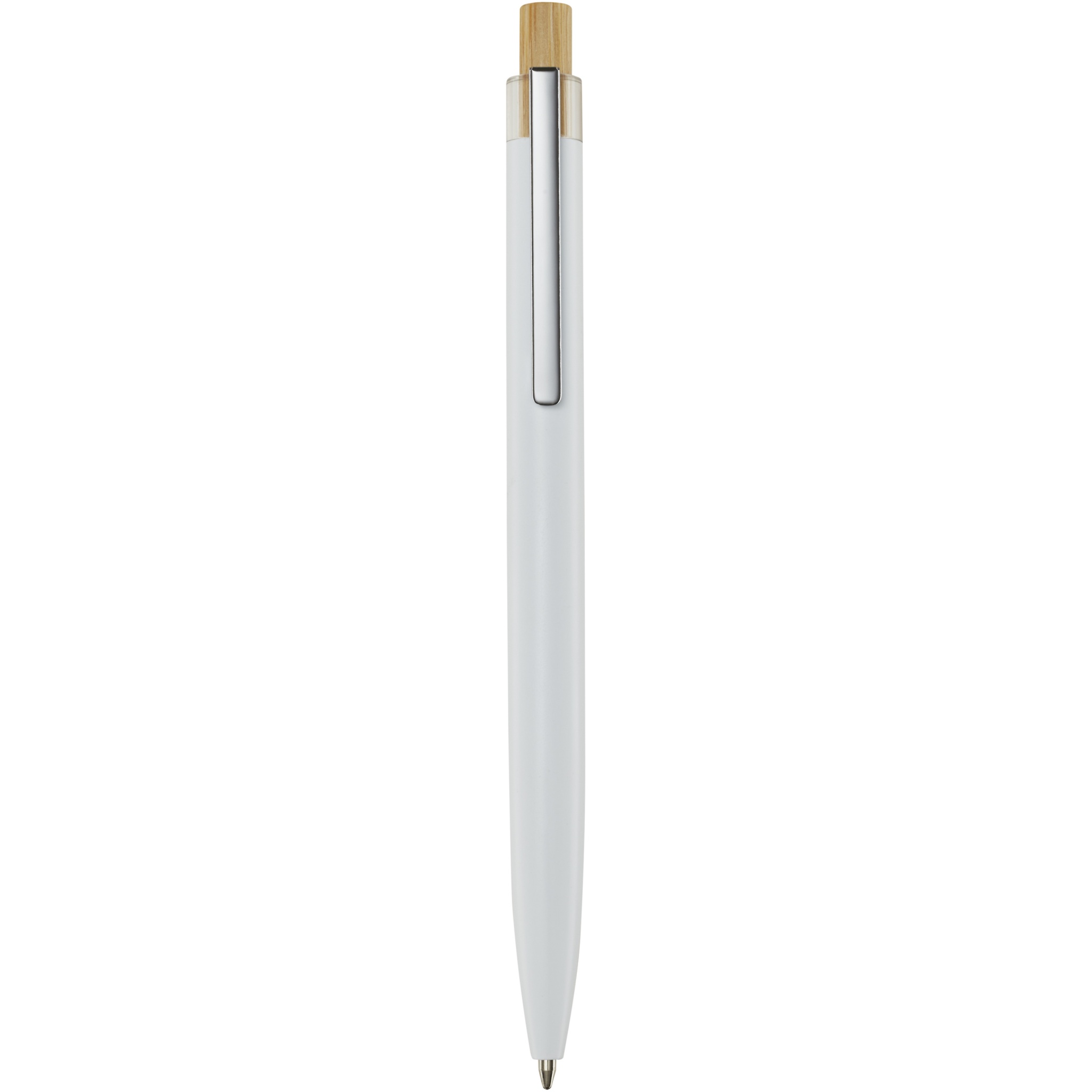 Der Nooshin Kugelschreiber wird aus recyceltem Aluminium hergestellt, was weniger Energie benötigt als die Herstellung von Aluminium aus Rohstoffen. Es reduziert außerdem die Abfallmenge auf Mülldeponien und trägt dazu bei, natürliche Ressourcen zu schonen und Treibhausgasemissionen zu reduzieren. Druckknopf ist aus Bambus gefertigt. Tintenfarbe: Schwarz. Schreiblänge: 800 Meter. Spitzengröße: 1,00 mm.
