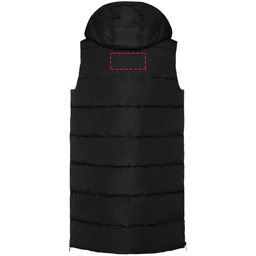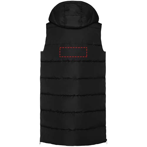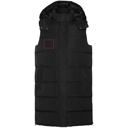 Wattierte Weste mit abnehmbarer Kapuze. Hoher Kragen. Reißverschluss auf der Vorderseite, verdeckt durch eine Patte. Zwei Taschen mit Druckknopfverschluss. Seitliche Öffnungen mit Reißverschlüssen. Zugang zur Brust von der Innenseite. Wasserabweisend.