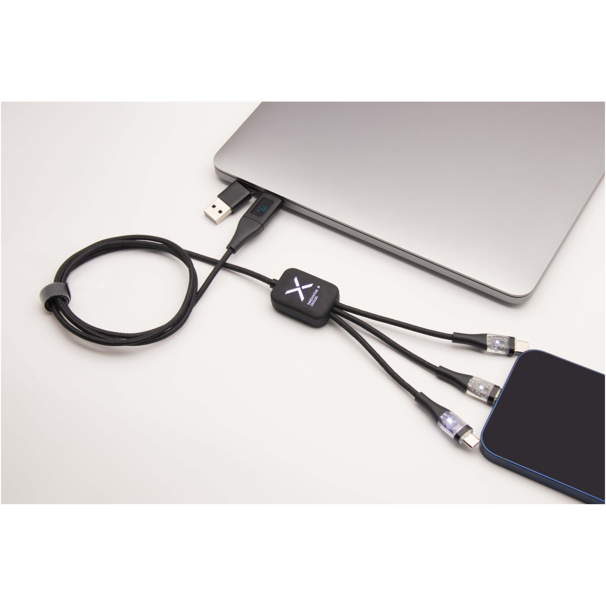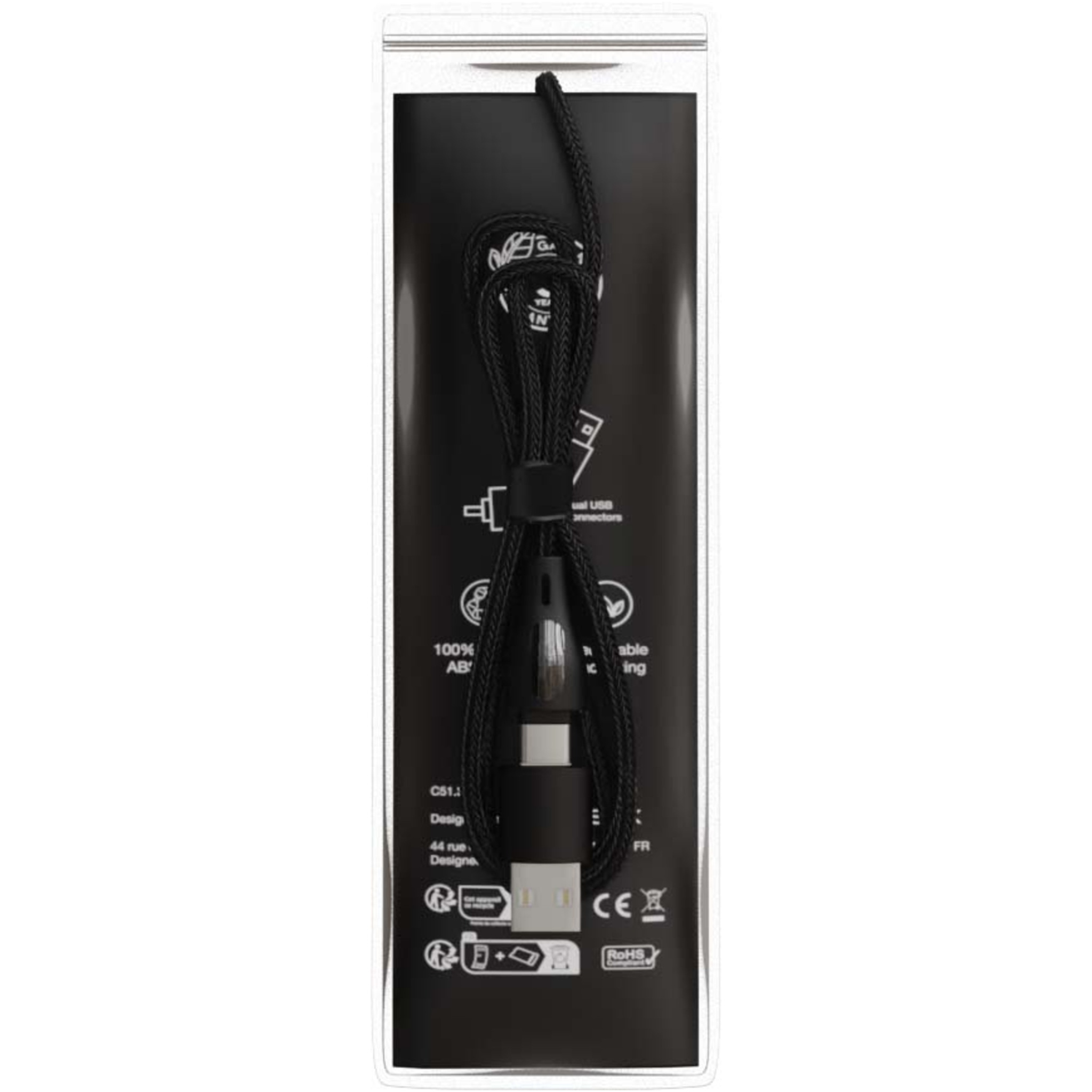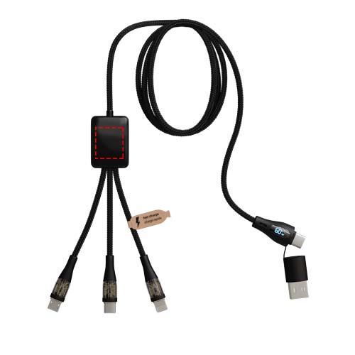 Das 5-in-1 60W Schnellladekabel aus recyceltem PET verfügt über ein beleuchtetes, beidseitig angebrachtes Logo und bietet 3 Anschlüsse (Typ C, iPhone und Android). Der duale USB-A- und USB-C-Eingang macht das Kabel 100 % kompatibel mit den neuesten Computermodellen. Das Kabel kann mehrere Geräte gleichzeitig aufladen. Geliefert mit einer wiederverwertbaren Tasche aus TPU und einer Einlage aus recyceltem Papier. Länge des Kabels: 1 Meter.