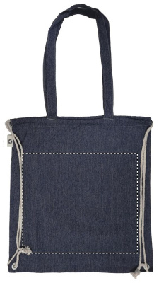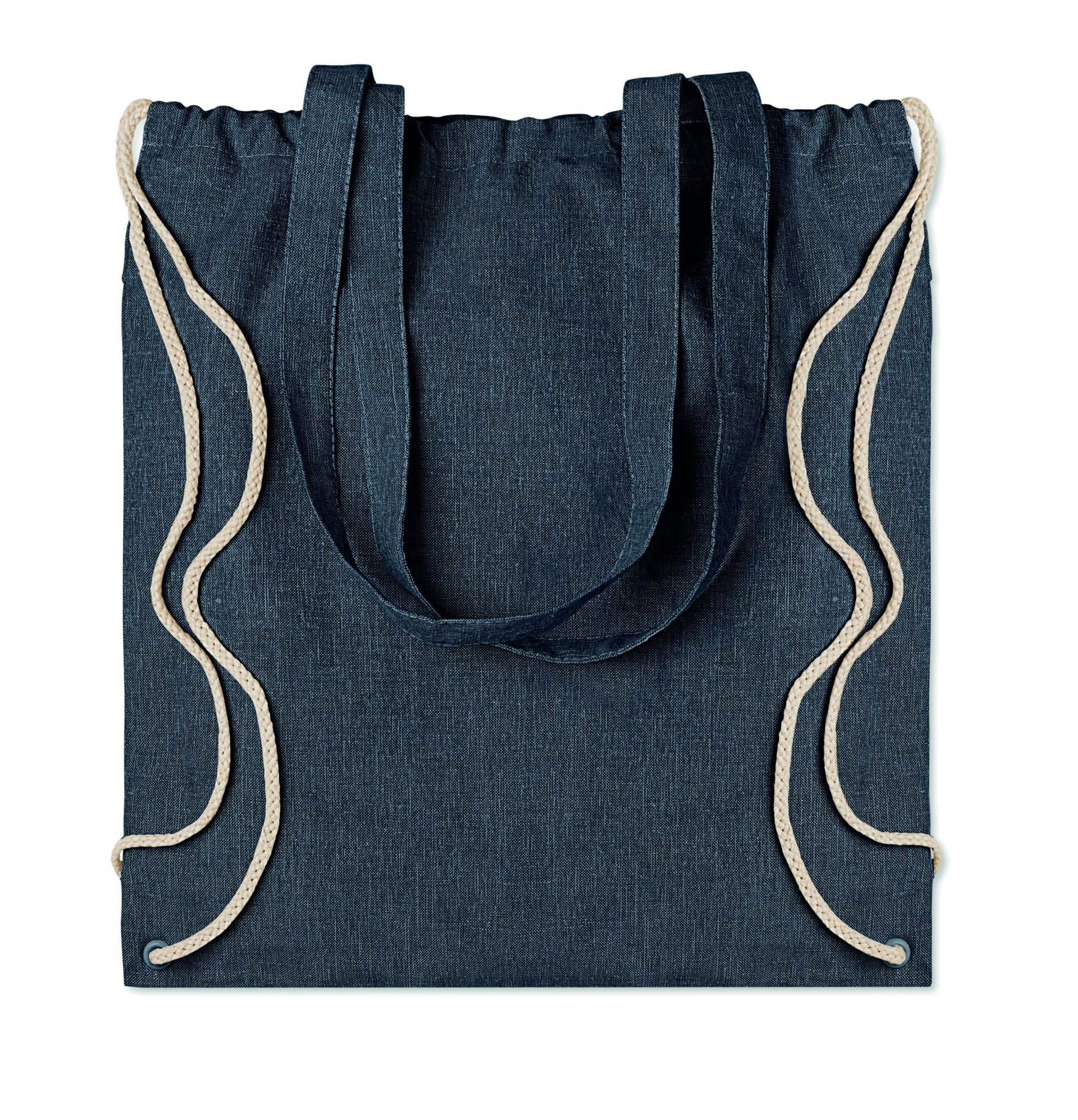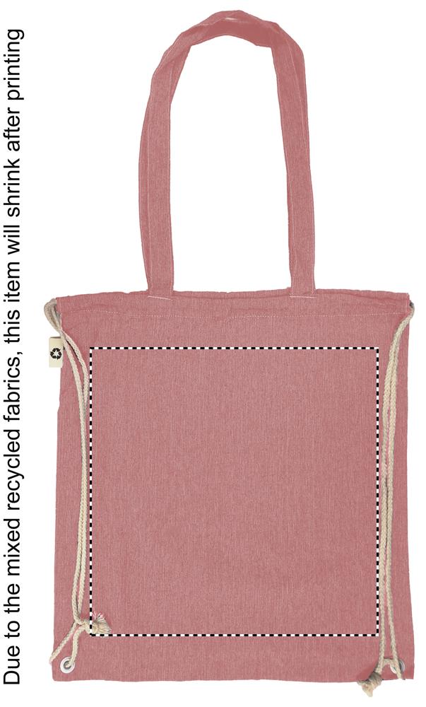 2 tone recycled cotton and recycled polyester shopping bag with drawstring and long handles (20%/80%). Approx. 140 gr/m². This item can shrink after printing.