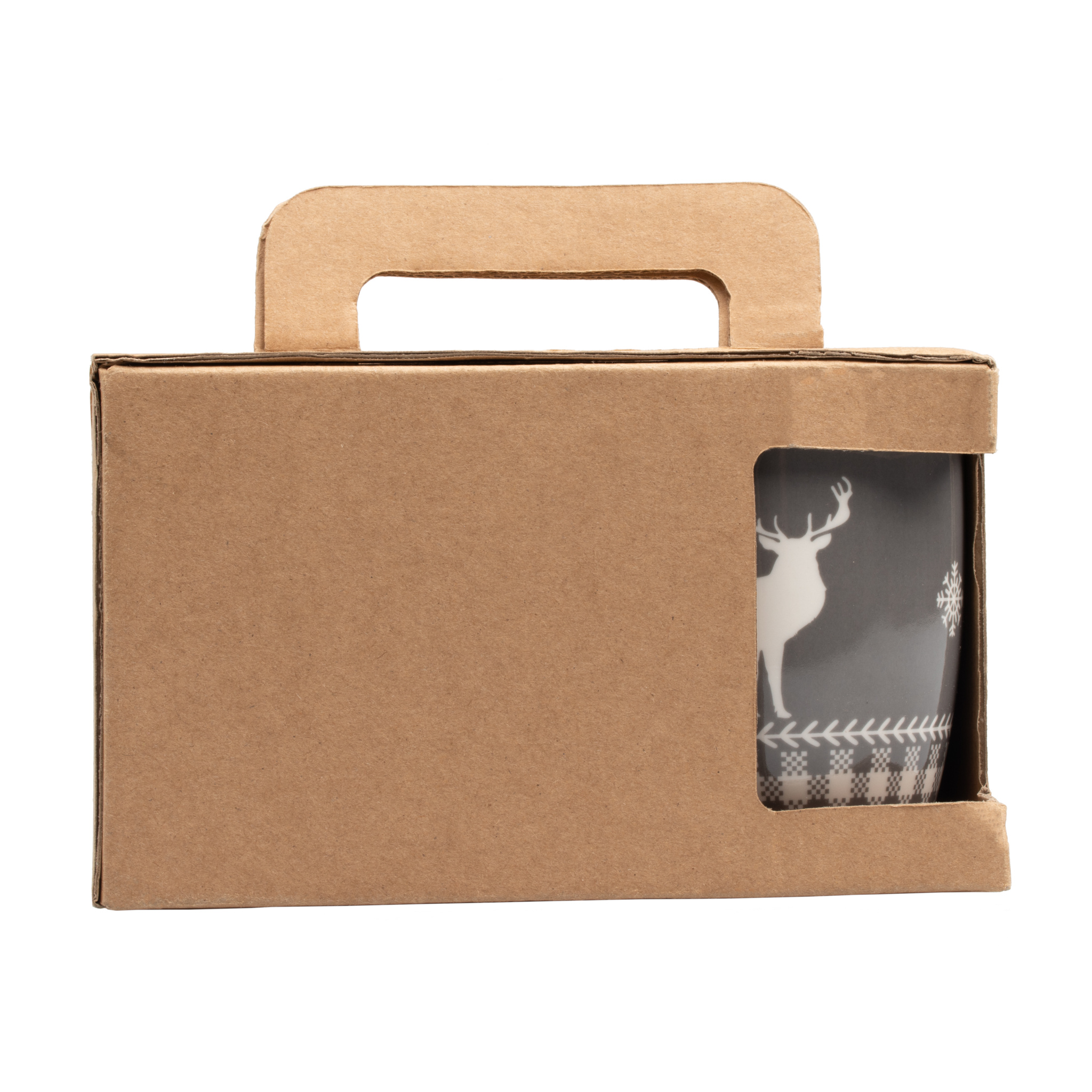 Set of two ceramic cups with a Christmas motif and a filling capacity of 300 ml each. The clever packaging is easy to put together and has a carrying handle. Your logo will be placed on the packaging.