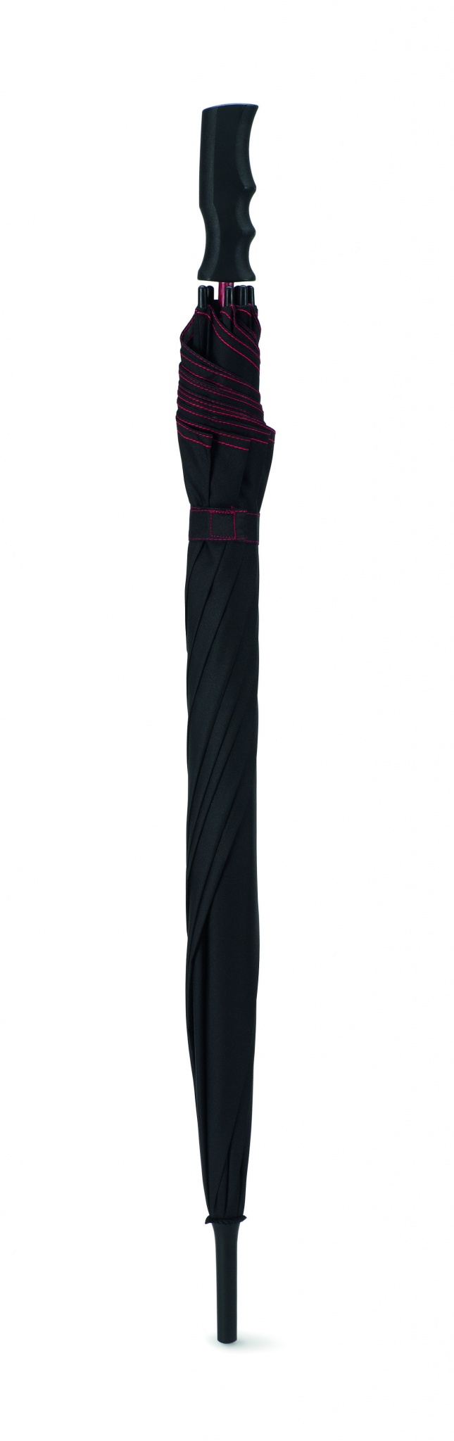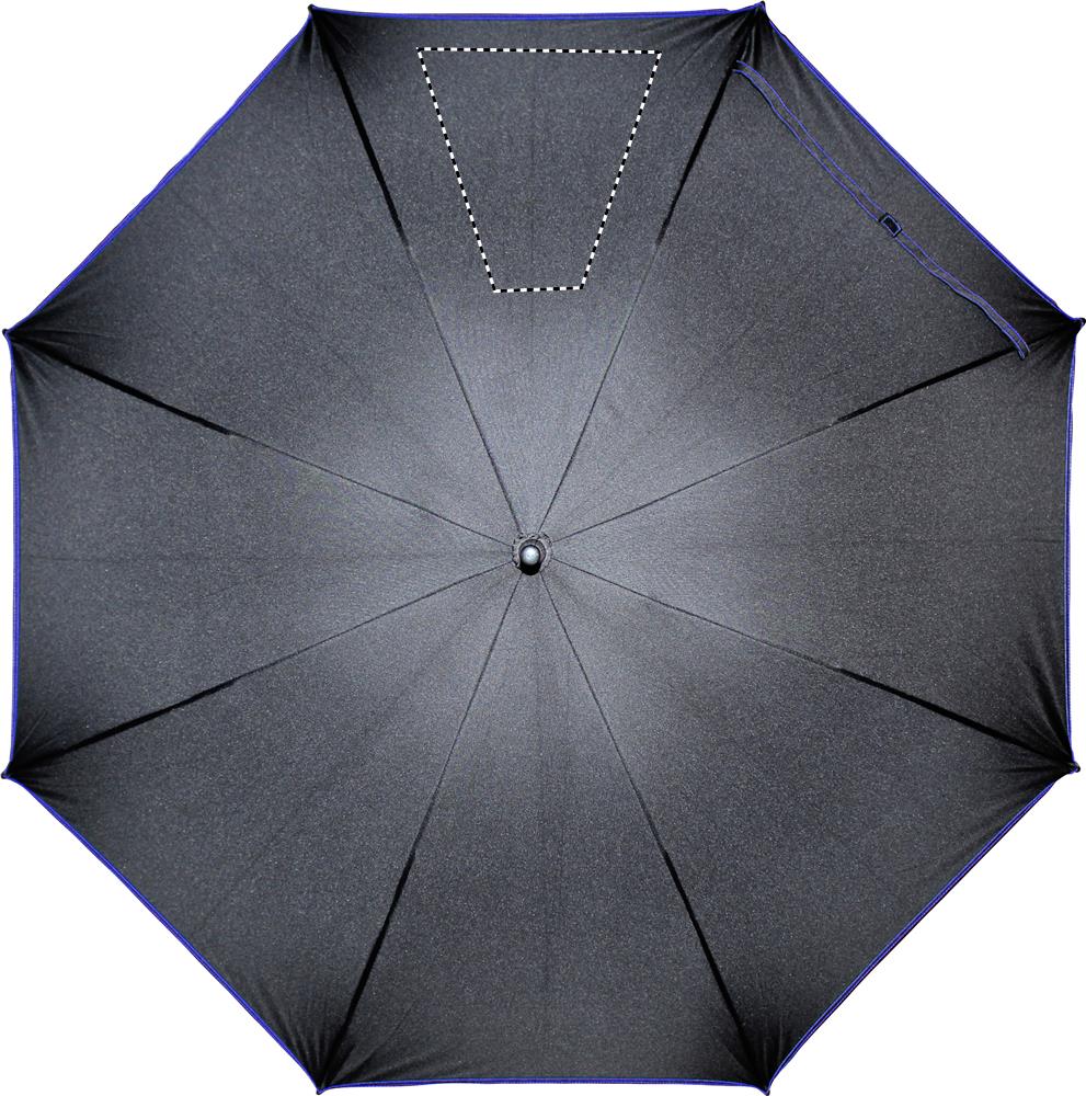 23 inch auto open windproof umbrella in 190T pongee with fiberglass shaft and ribs in colour with black plastic tips. Panels in black with matching colour stitching. Straight black plastic handle. Manual closure.