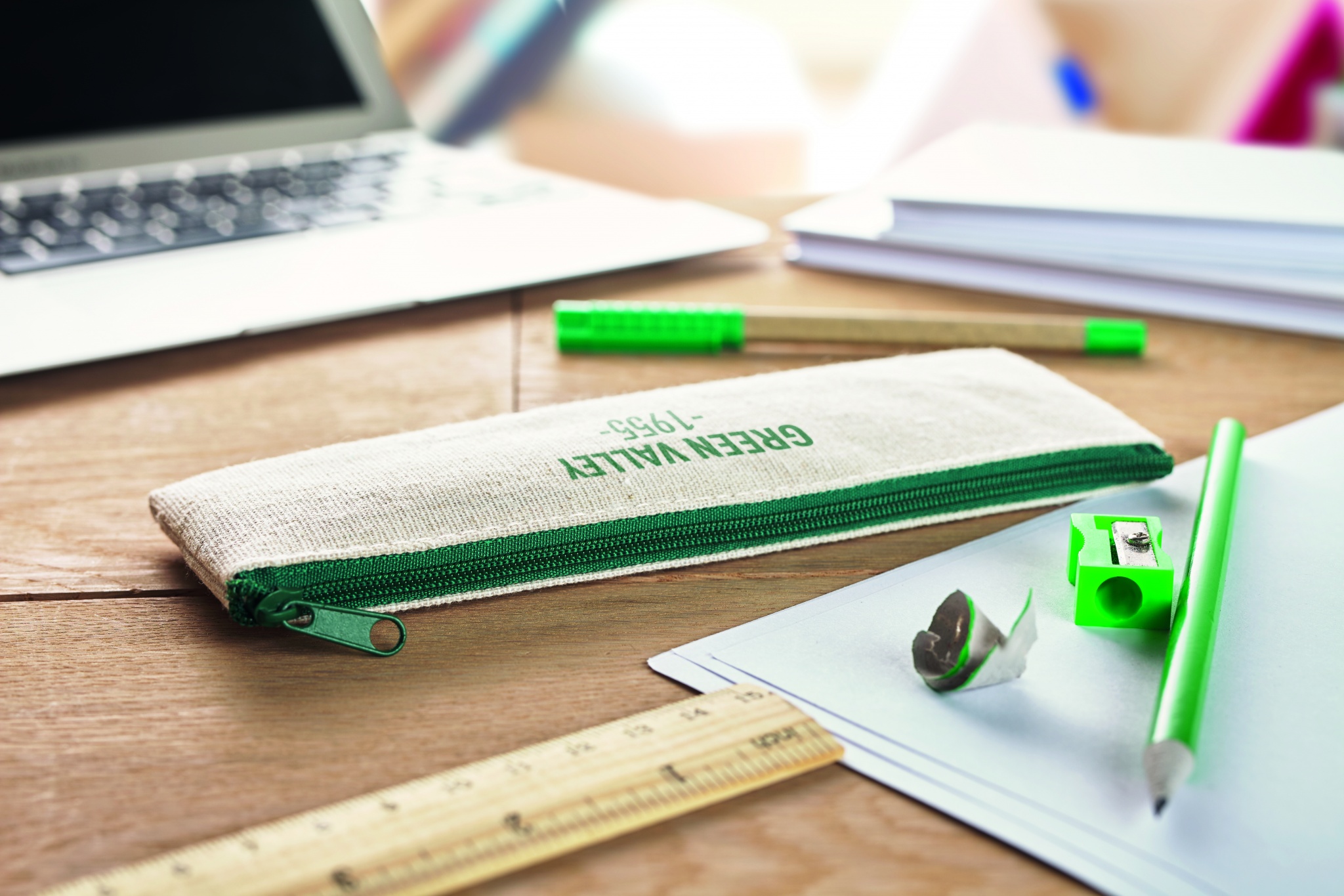 6 piece stationary set. Includes a jute and cotton case, wooden ruler, plastic sharpener, eraser, paper pencil and ball pen with blue ink.