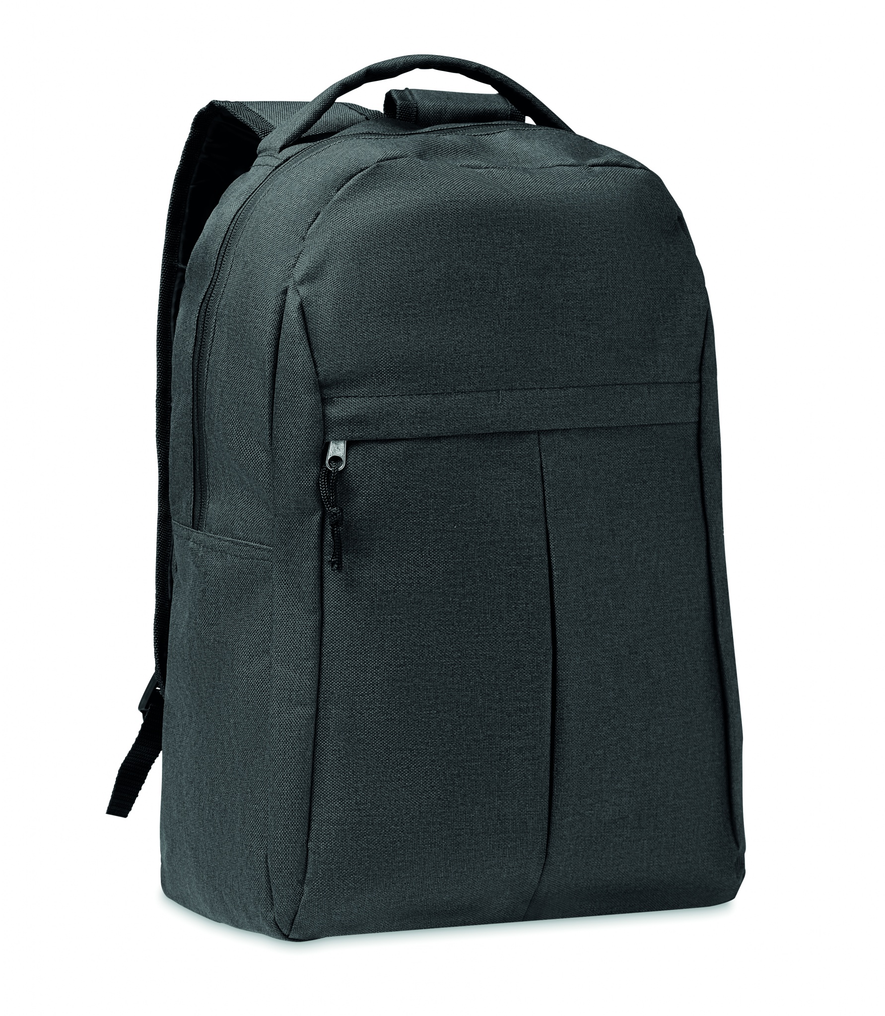 Backpack in 600D RPET 2 tone polyester with outside pocket with zipper and mesh pocket on the side.