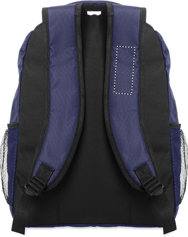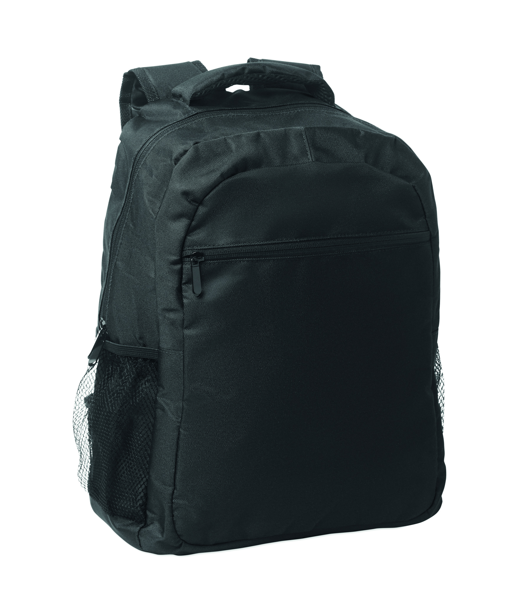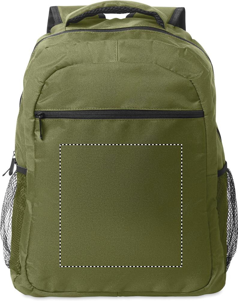 Laptop backpack 15inch in 600D RPET polyester with padded laptop compartment inside, mesh pockets on both sides and zippered front pocket.