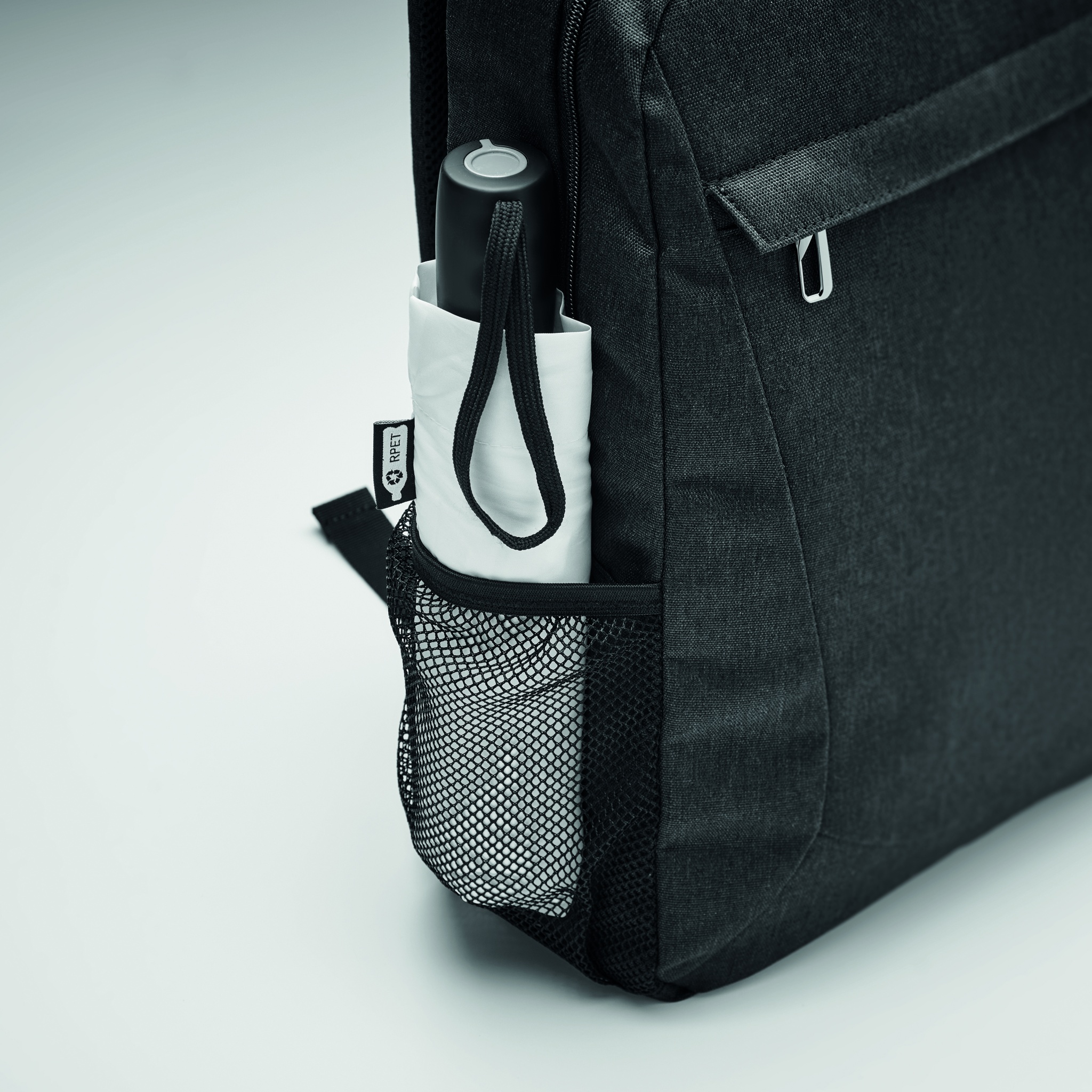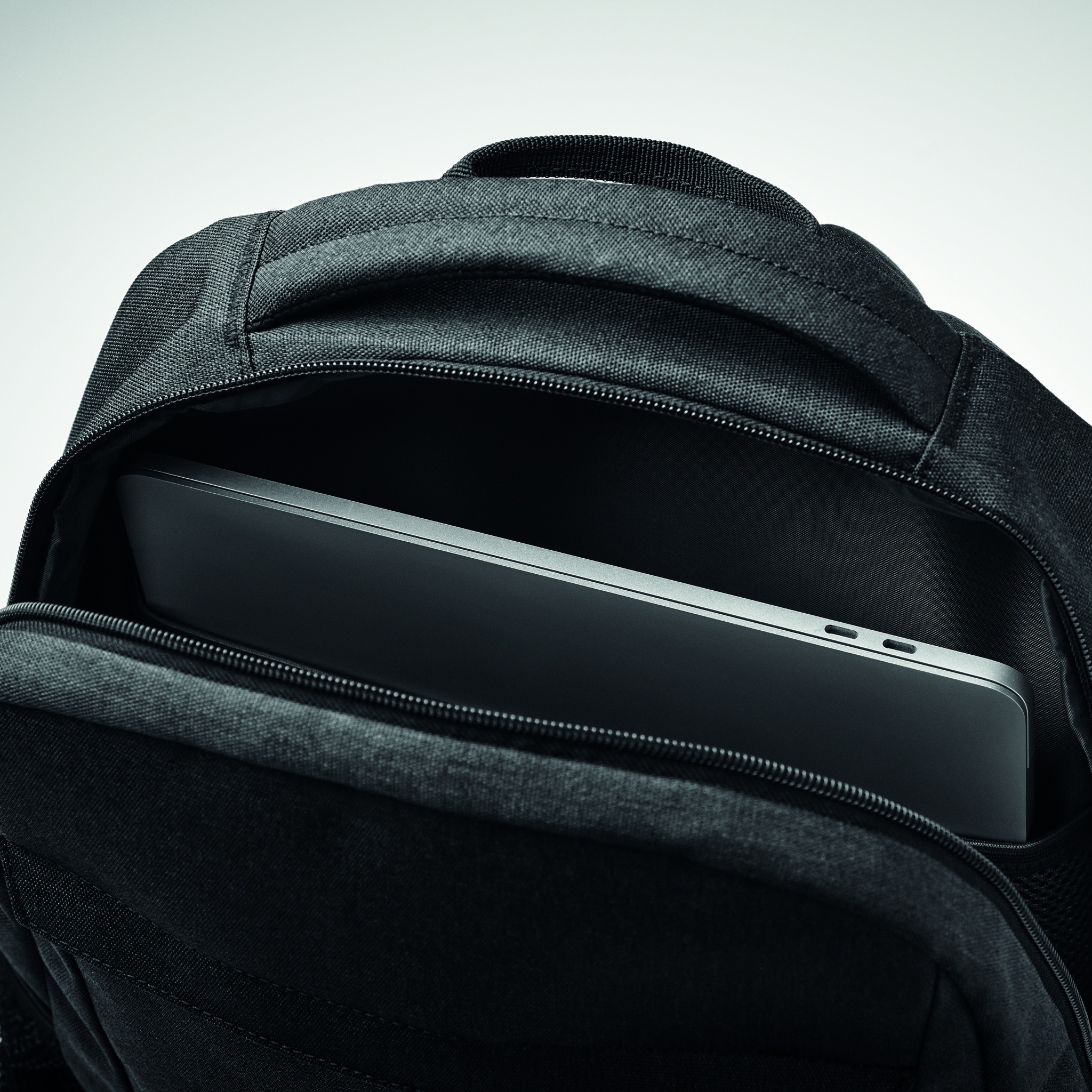 15 inch laptop backpack in 600D RPET polyester. Internal laptop compartment and several small inner compartments. It has a front zippered pocket and 2 side mesh pockets. Adjustable shoulder straps. Trolley holder on reverse side.