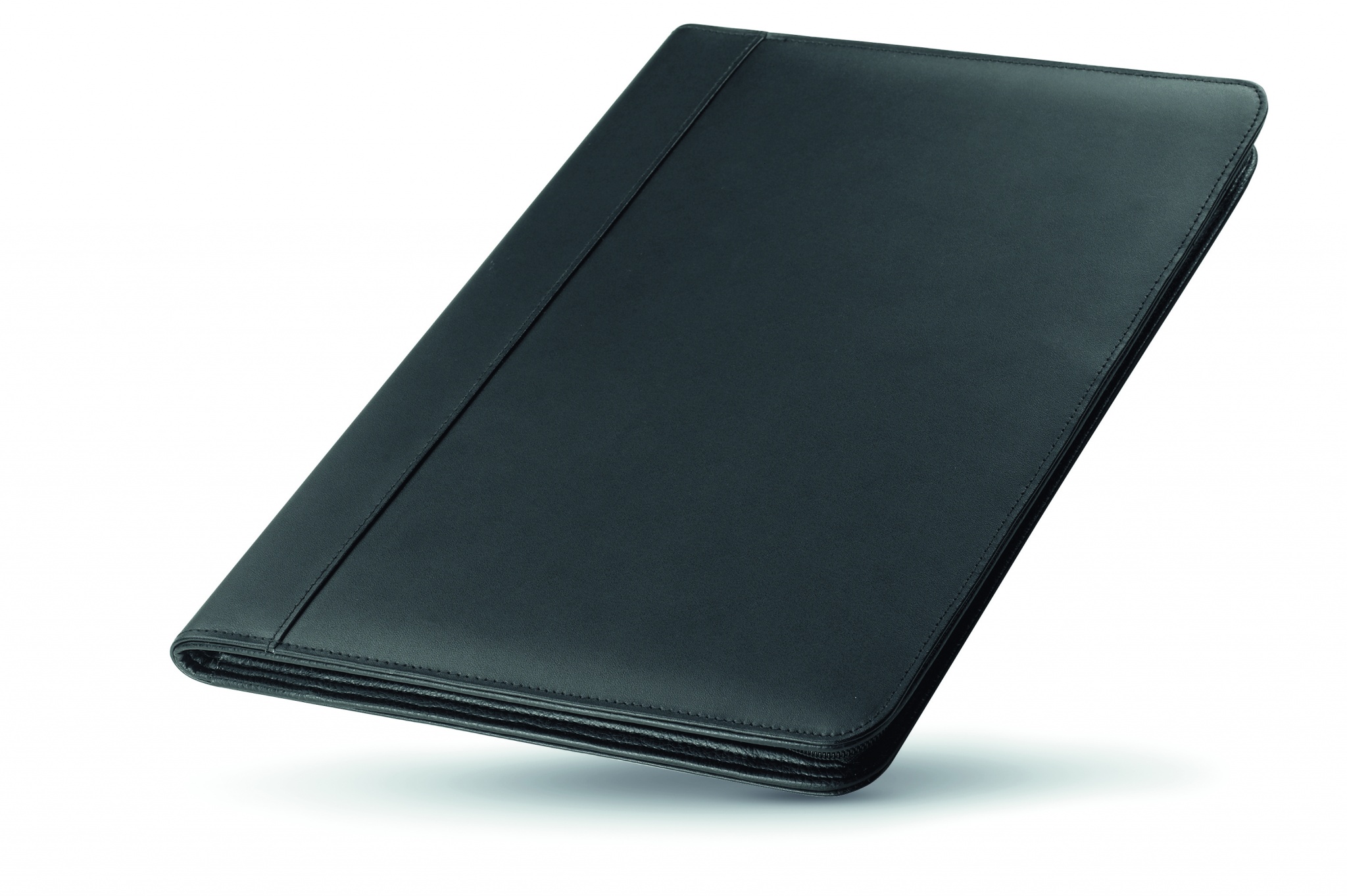 A4 conference folder with bonded leather cover. Zipped. 25 plain sheets notepad. 4 inner compartments. Pen holder.