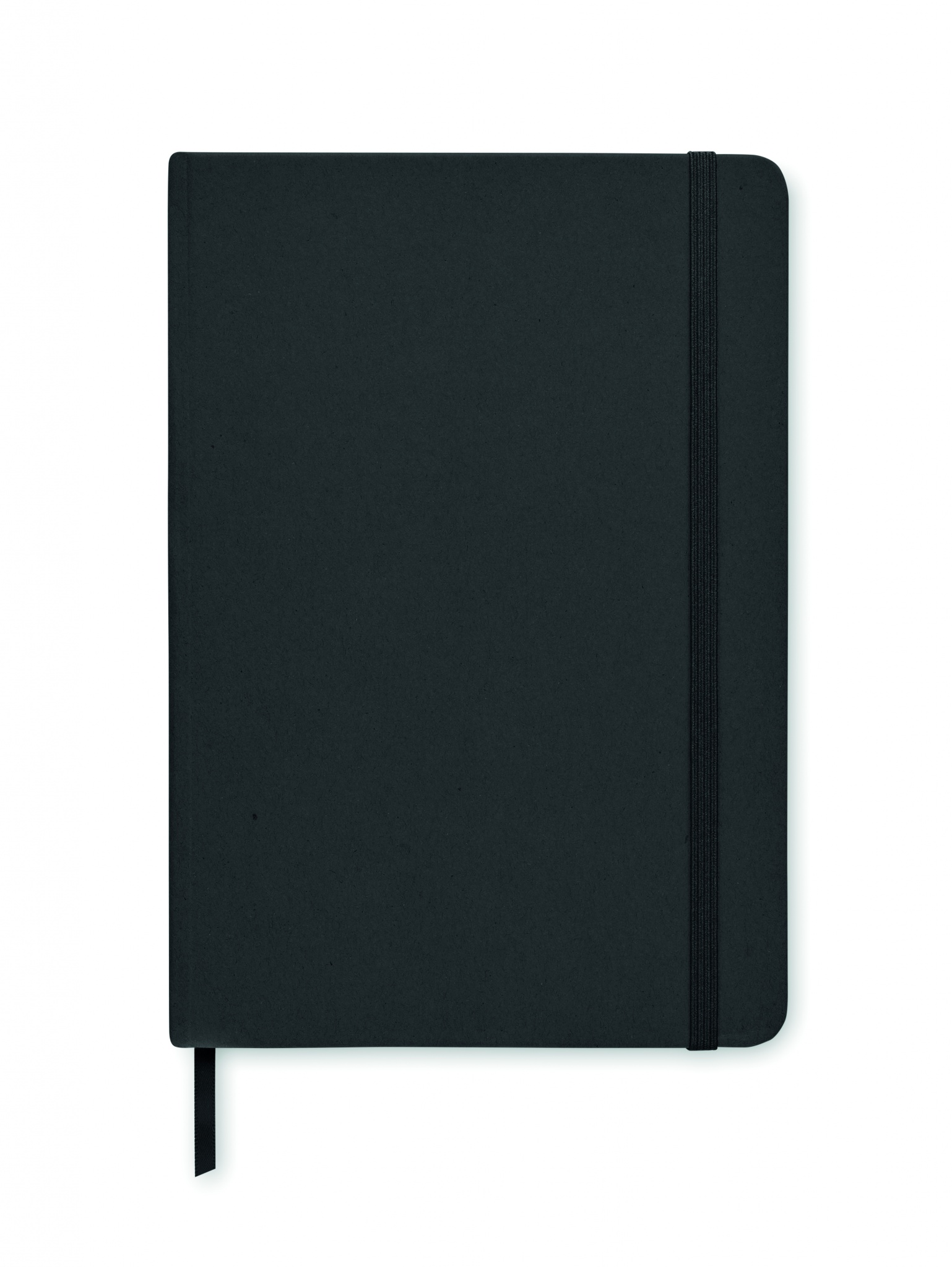 A5 notebook with hard recycled carton cover. Casebound. 160 stone paper lined pages (80 sheets). Elastic closure strap and ribbon page-marker.
