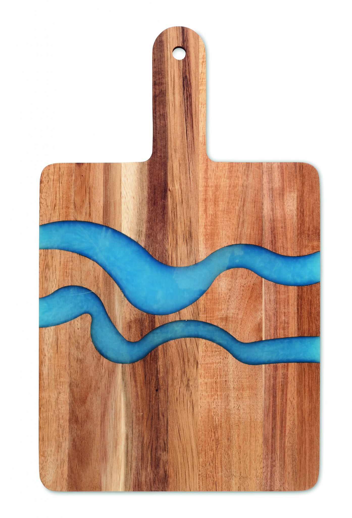Acacia wood serving board with epoxy resin detail and handle. Wood is a natural product, there may be slight variations in colour and size per item, which can affect the final decoration outcome.