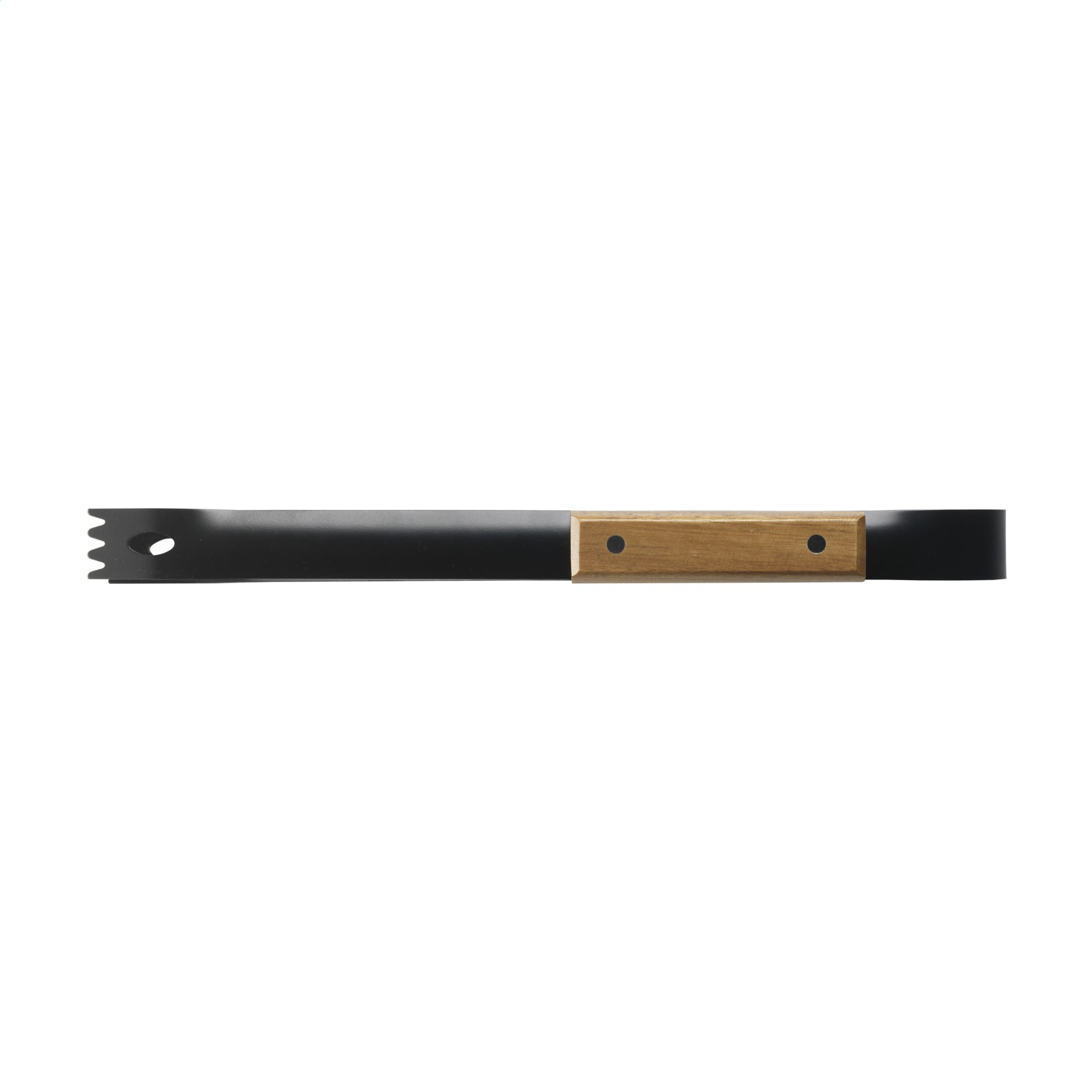 4-piece barbecue set: spatula, fork, knife and meat tongs. The stainless steel has a beautiful, black coating and the accessories have handles made from acacia wood. This chic set comes in a 600D nylon pouch.