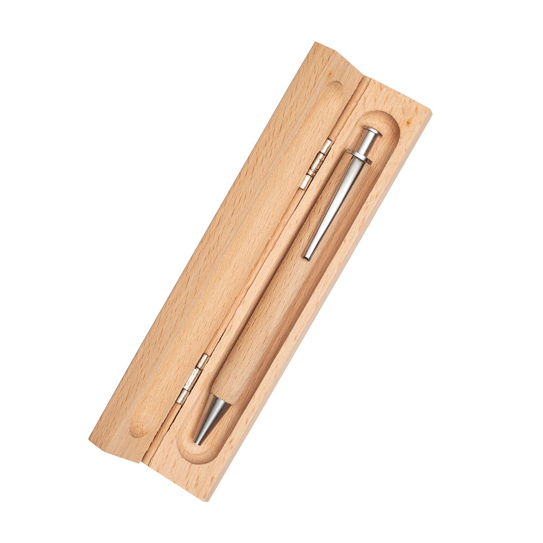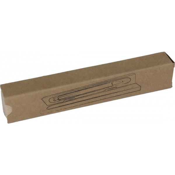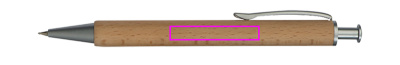 Wooden ballpen with blue-writing metal system refill and a wooden case. The laser engraving is mounted below the clip.