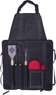 BBQ apron with three different BBQ tools and one glove. Apron in 600D polyester.