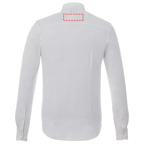 Self fabric collar. Stretch fabric. Adjustable cuff with single pleat. Button-down collar. Satin piping at inside neck. Dyed-to-match engraved buttons. Woven main label.