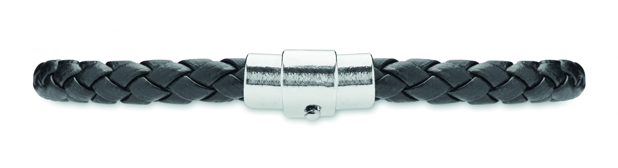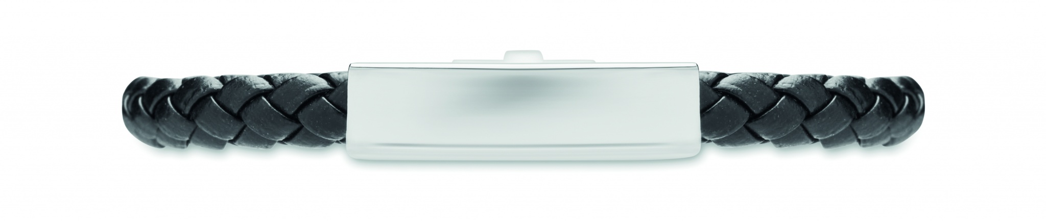 Braided faux leather cuff bracelet with polished steel hardware. Push-lock clasp. Wrist circumference: 18 cm.