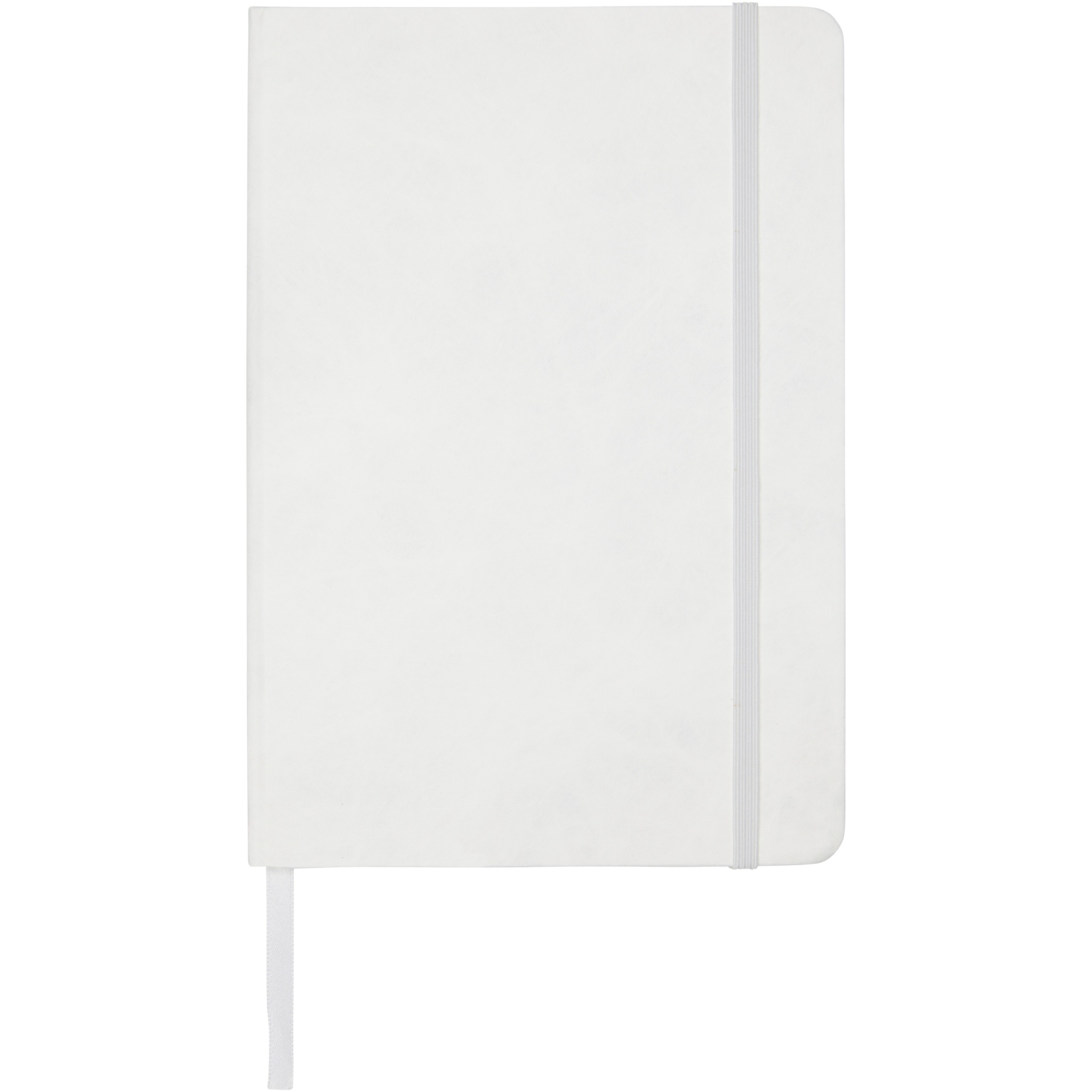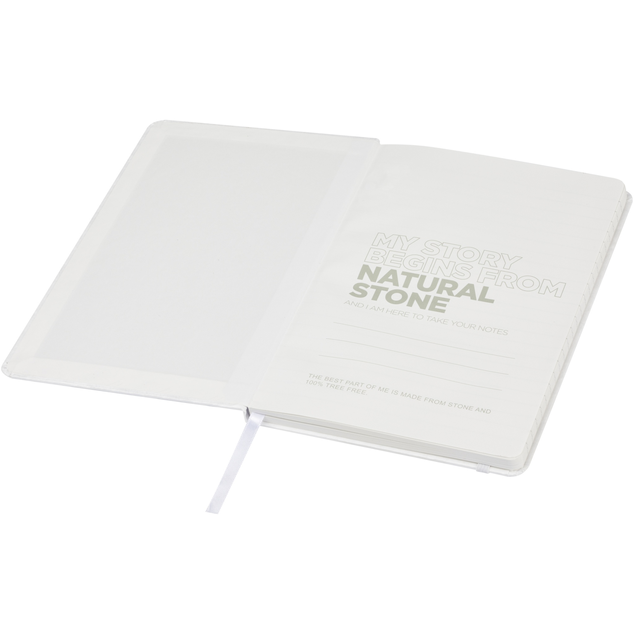 A5 size tear resistant notebook with inner pages made from stone. Stone paper is 100% tree free and the production process uses less energy compared to recycled or new pulp paper. It's water resistant so liquids spilled can easily be wiped off. Features a colour matching ribbon marker and elastic band and 60 sheets 120 g/m² lined stone paper. Packed in a cardboard sleeve.