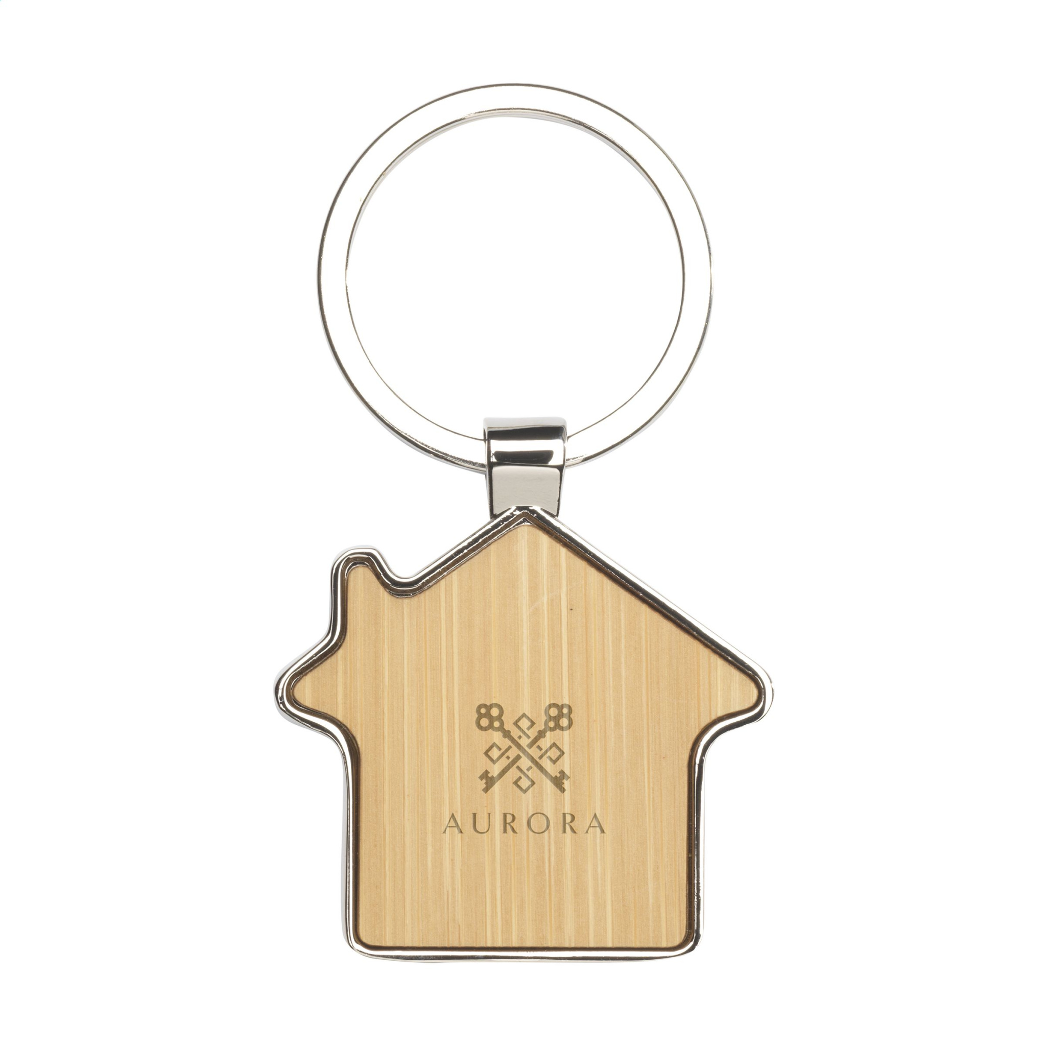 Keyring in the shape of a house. With polished, metal casing and bamboo wooden inlay. Each item is supplied in an individual brown cardboard envelope.