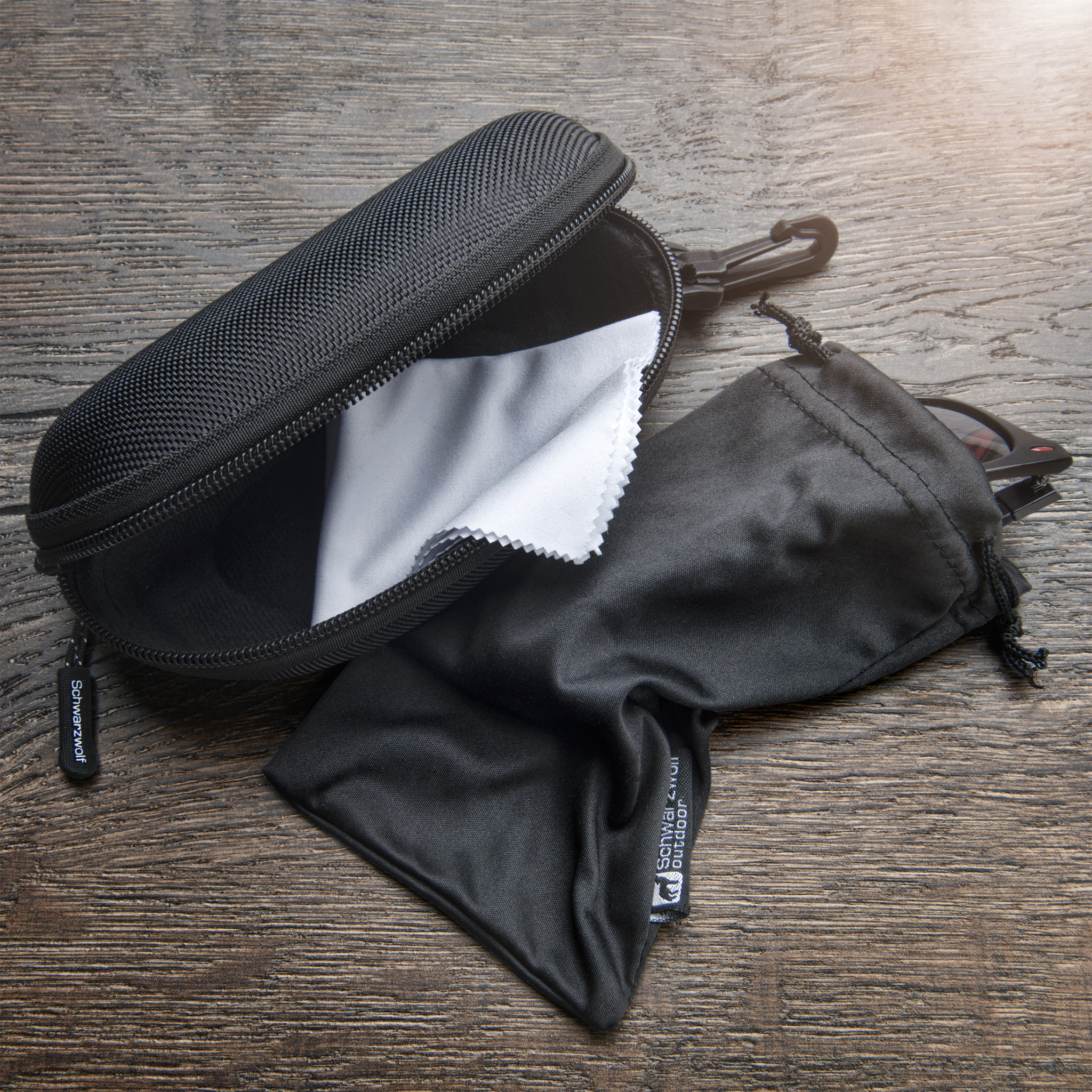 Hard case for sunglasses. The case is made of canvas and velvet material, in black colour. The case has a zipper and Schwarzwolf logo on the zipper slider. Includes a black microfibre pouch and a white microfibre cleaning cloth suitable for sublimation. Packed in a Schwarzwolf gift box.