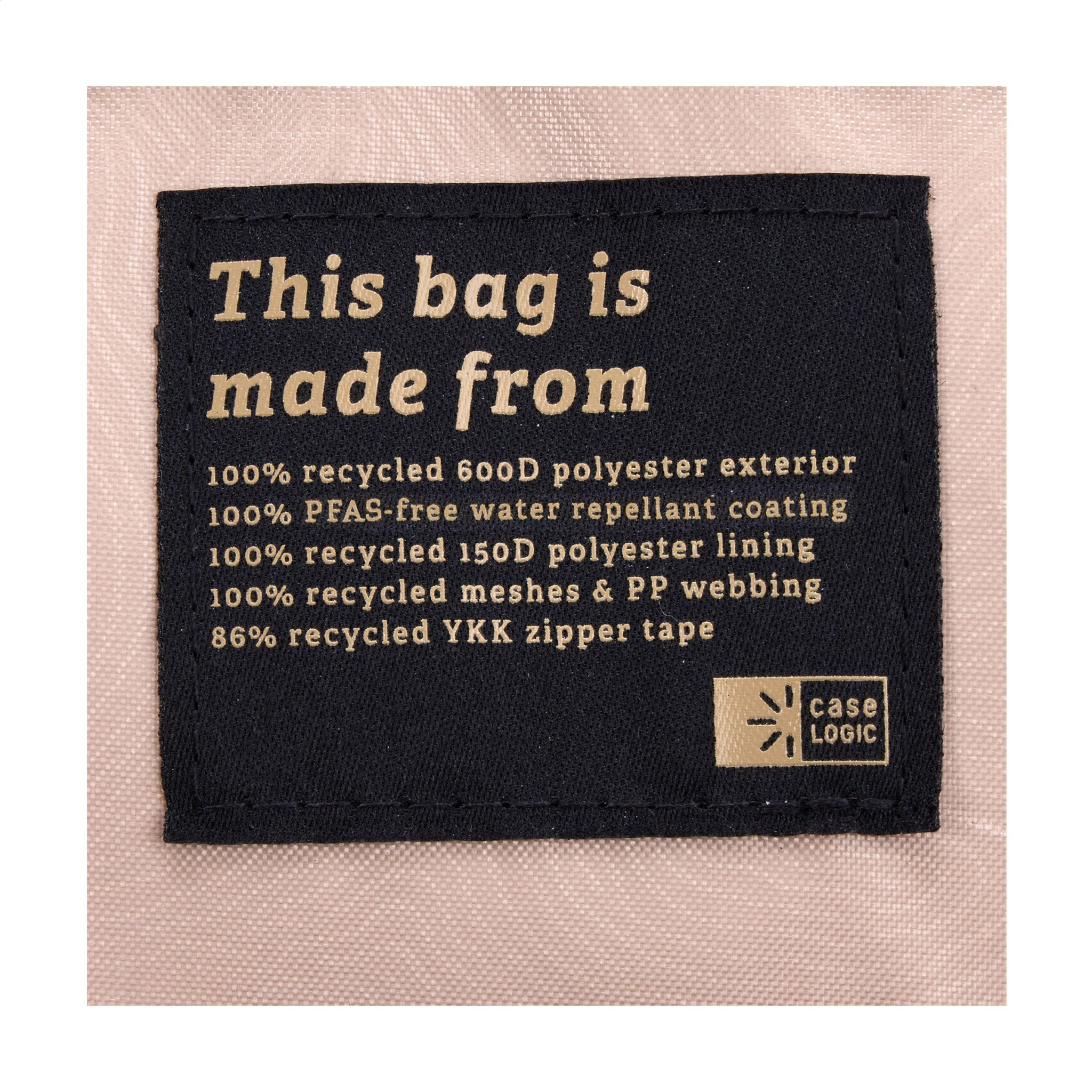 Sturdy laptop-backpack from the Case Logic brand. Made from 82% recycled materials: 100% recycled 600D polyester exterior with PFAS-free water-repellent coating, recycled 150D polyester lining and YKK zips with a zip tie made from 86% recycled material. The backpack has two main compartments and thoughtful organisational features. The various compartments feature a protective foam layer for optimal protection of a 16.6-inch laptop and a 12.9-inch tablet, several slip pockets and a zipped mesh pocket. The hidden security pocket on the back panel keeps important items such as passport or wallet hidden yet within easy reach. With breathable mesh on the back panel, padded and contoured shoulder straps and a softly padded mesh handle for extra carrying comfort. Easy to attach to a trolley. The recycled materials guarantee a long lifetime. Capacity approx. 21 litres.