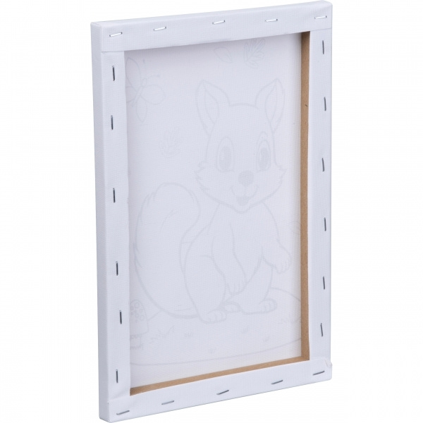 Canvas with wooden frame and squirrel motif for coloring. Five different paint colors (black, red, orange, yellow, and green) are included. Your logo is applied to the individual packaging using a CMYK sticker.