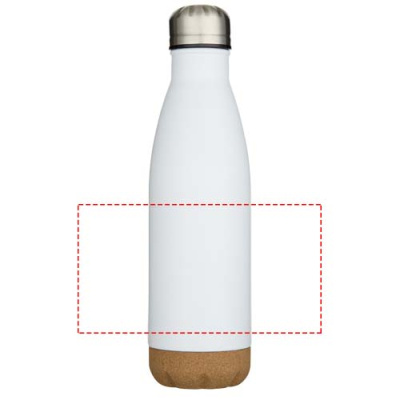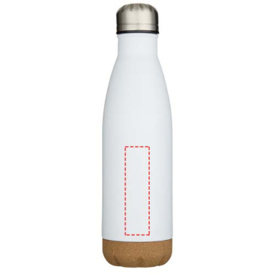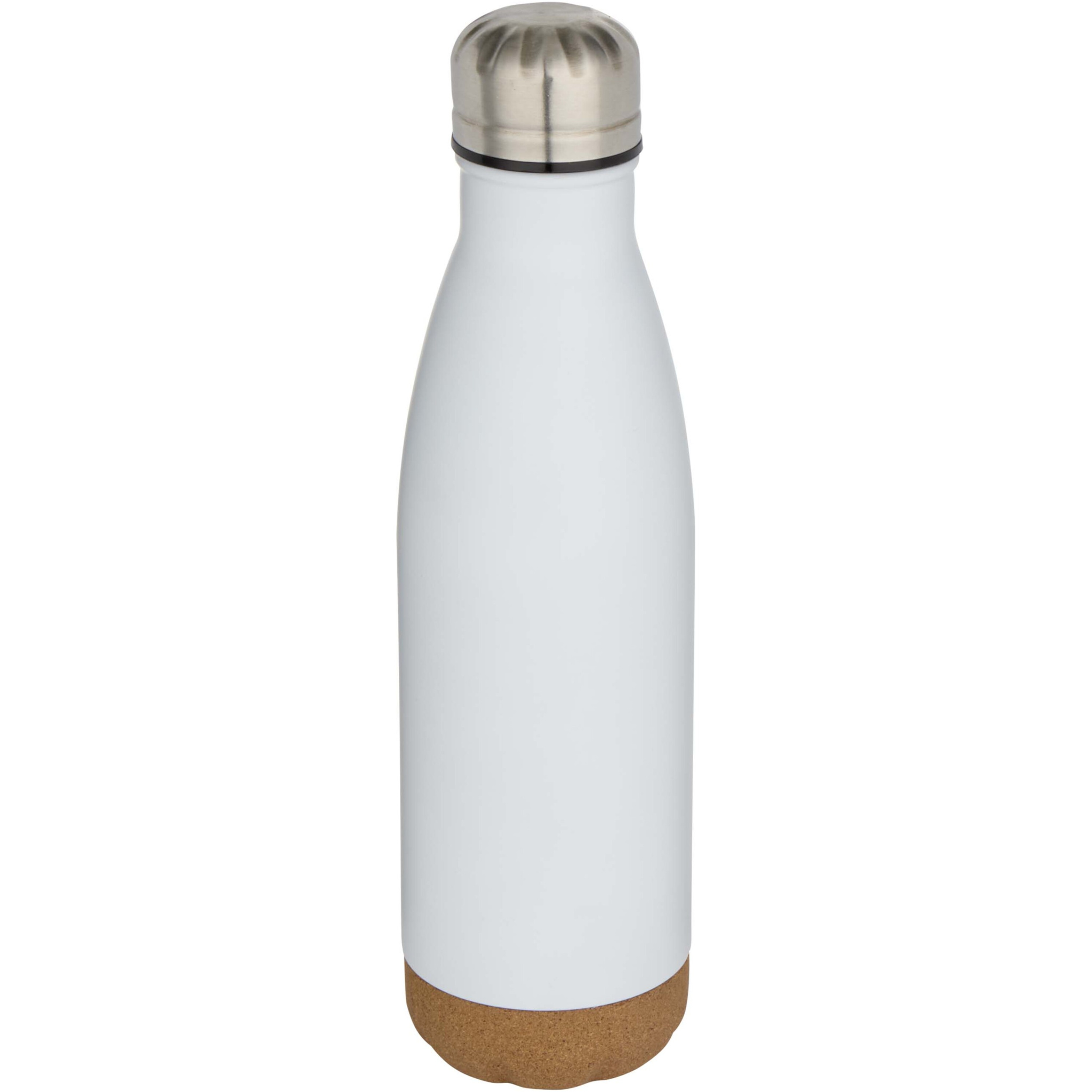 Vacuum insulated stainless steel water bottle with cork details at the bottom. The double-wall insulation keeps drinks hot or cold for several hours. Presented in a recycled cardboard gift box. Volume capacity: 500 ml.