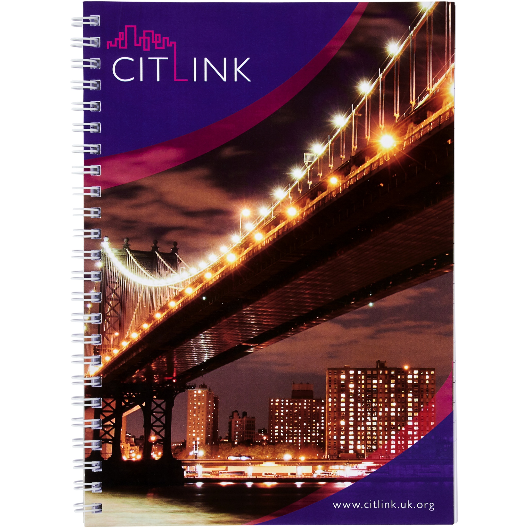 Desk-Mate® spiral A4 notebook. This notebook includes a white or black wire, a glossy card front cover (250 g/m2) and blank paper (80 g/m2). Standard delivered with 50 sheets, also available with 80 sheets. You can customise the pages of this versatile notebook with any design - so whether you want lined paper, squares or dots - anything is possible!