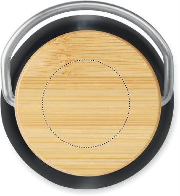 Double wall stainless steel insulating vacuum flask with lid in bamboo and carry handle. Capacity: 500 ml. Sublimation print available on white item only. Leak free. Bamboo is a natural product, there may be slight variations in colour and size per item, which can affect the final decoration outcome.