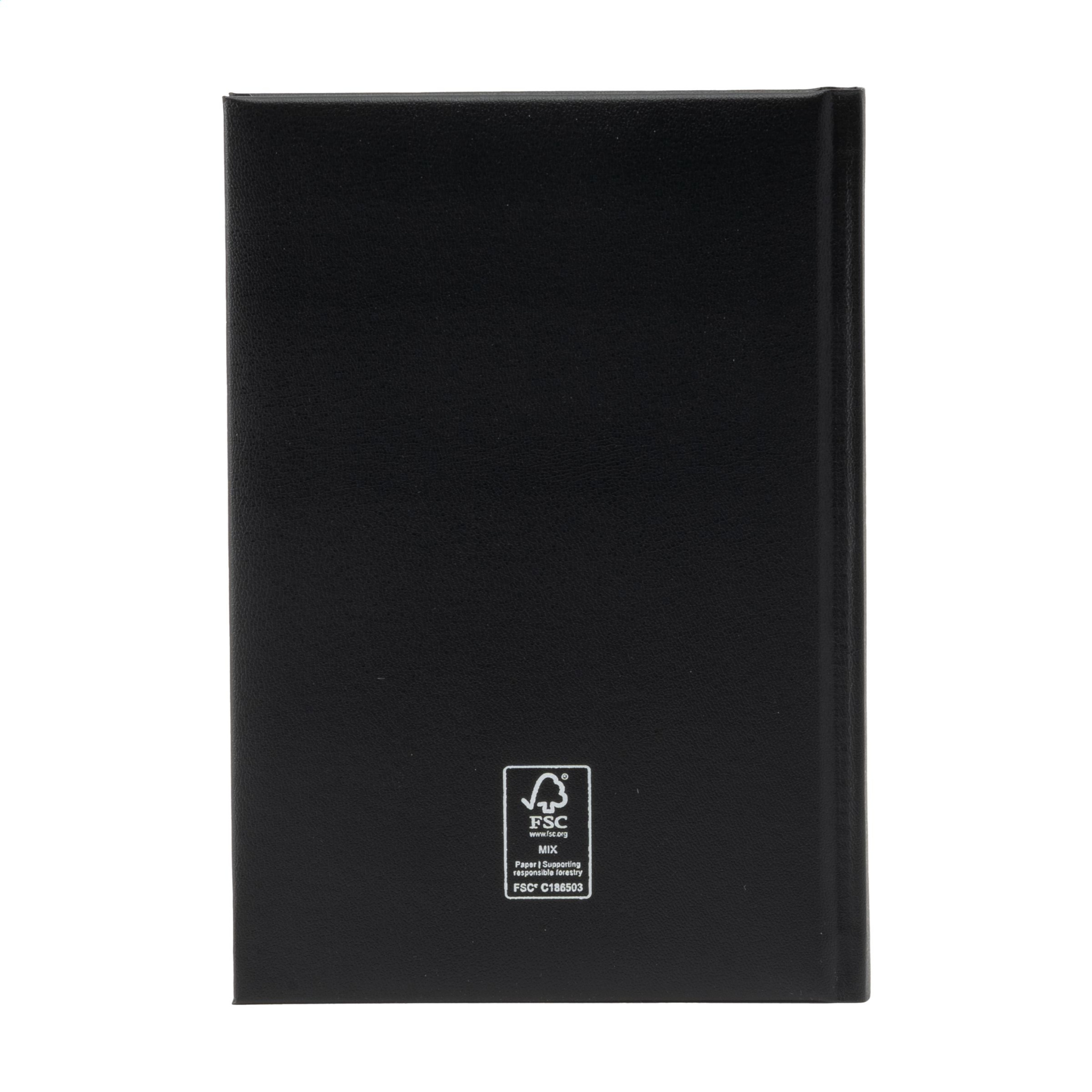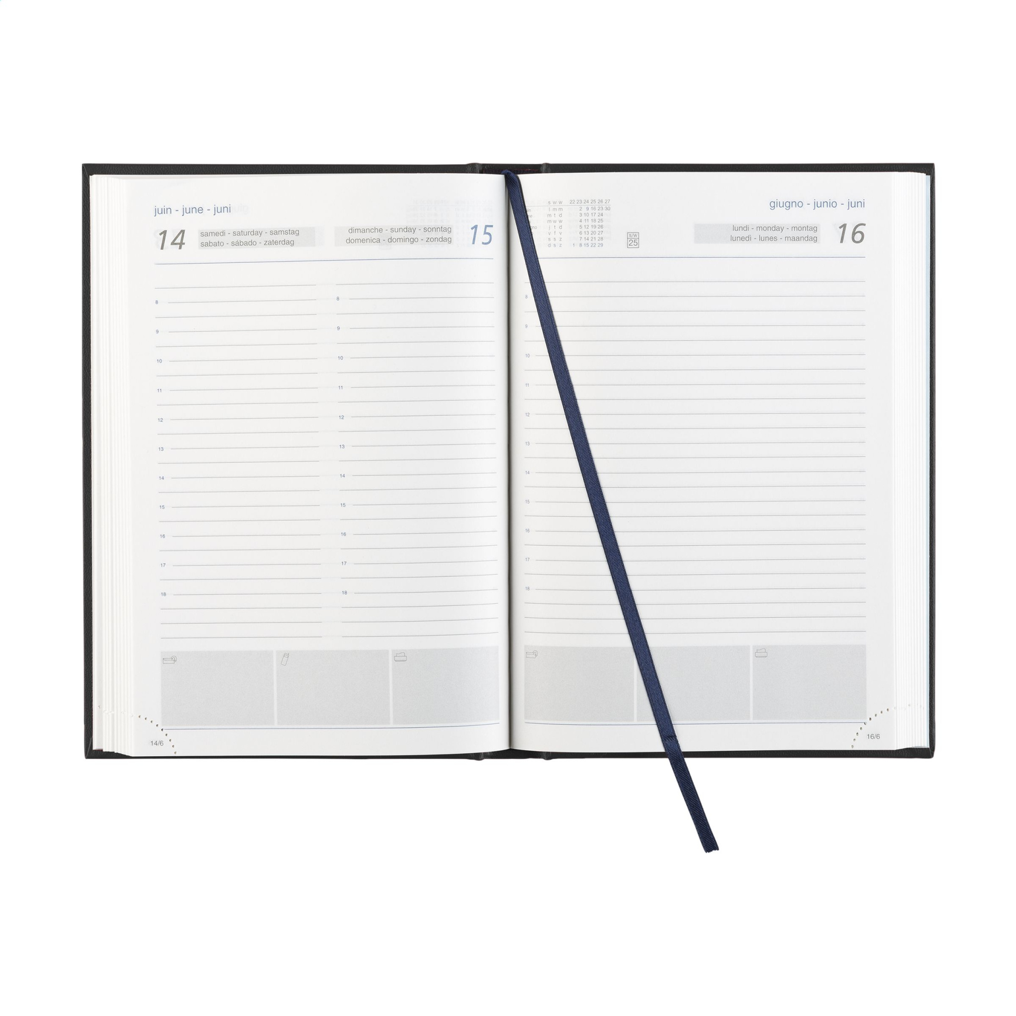 Six language office diary: EN, NL, F, D, I and ES. With durable padded Balacron cover and the year decoratively embossed on the front, 70 g white, FSC Mix certified paper, printed in 2 colours, thread bound, with tear-off dated corners, one day per page (Saturday and Sunday combined), year planner current year and 2 quarters of the next year, note space for each day, additional pages of useful information. Close to A5 size.