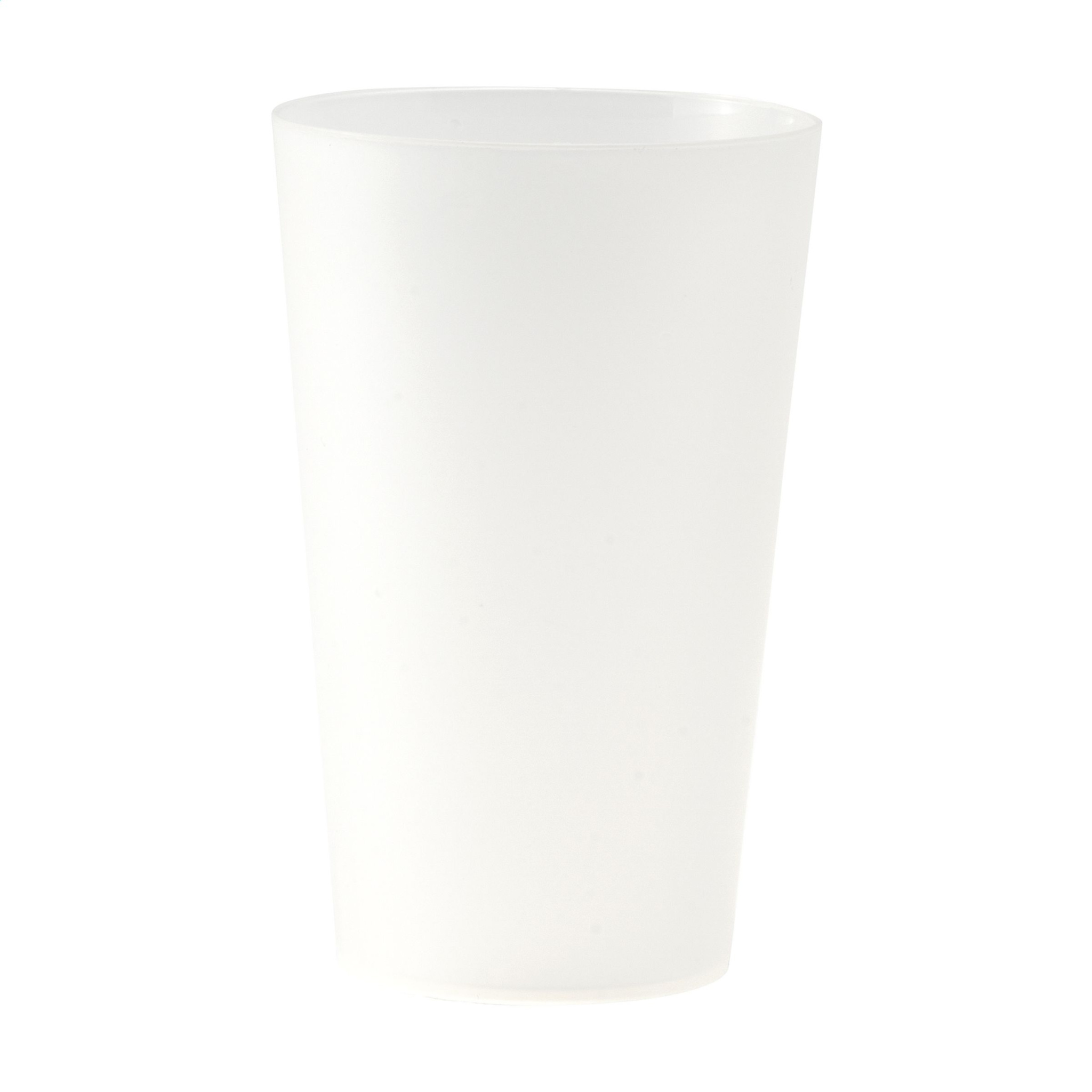 Reusable cup made from high-quality plastic. Including full colour printing all over. This cup is lightweight, easy to clean and stackable, making it a great space saver. Available in a matte and a clear version. BPA-free and Food Approved. Microwave safe and dishwasher-safe. Washing by hand is recommended to preserve the imprint. 100% recyclable. This cup contributes to a circular economy. The perfect reusable, personalized cup for events and festivals. Made in Europe. Capacity 330 ml.
