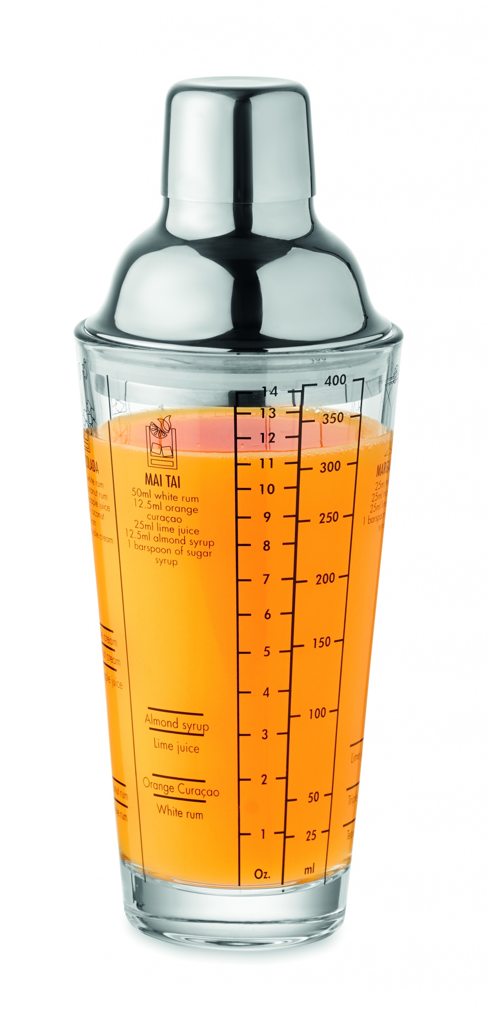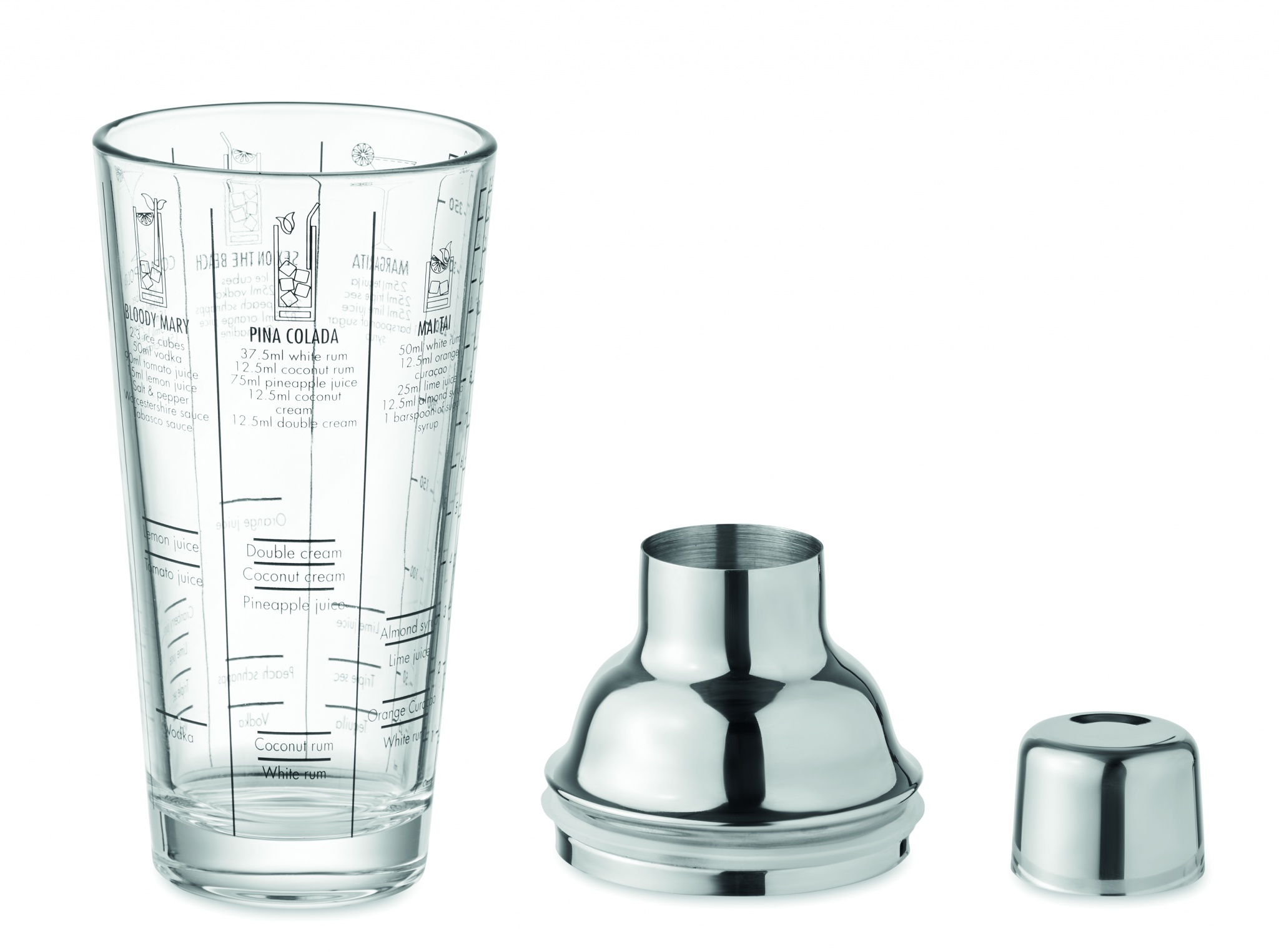 Glass cocktail shaker with stainless steel lid with strainer. Printed cocktail recipes and measurements on the glass. Capacity: 400 ml.