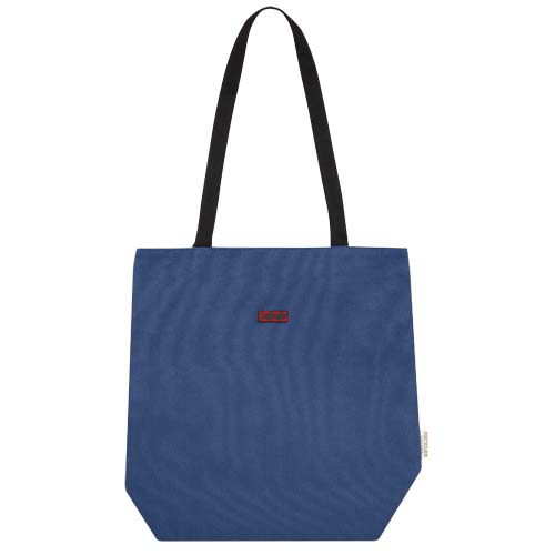 Tote bag made of GRS certified recycled canvas and GRS certified RPET lining. This versatile tote bag features a padded 15" laptop compartment and two sleeve pockets inside for a phone, wallet or accessories, and an easy button closure to the opening and comfortable cotton webbing handles. The decorative metal plate can make a logo shine through its subtle and matt finish.