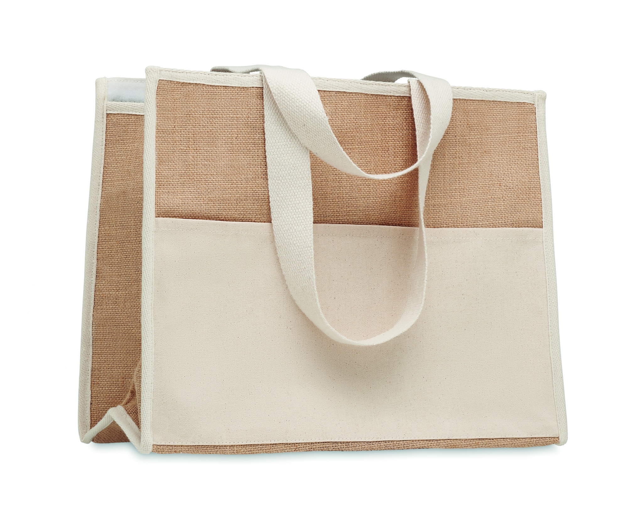 Jute shopping and cooler bag with long handles, laminated and with hook and loop closure, front with canvas pocket and cotton webbing.