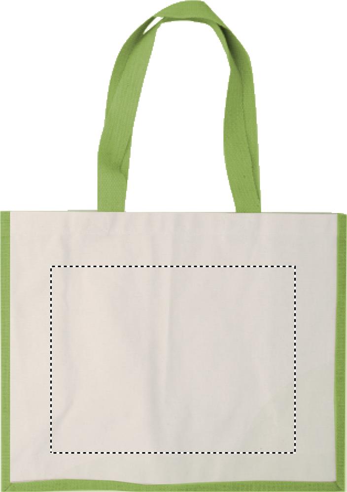 Jute shopping bag laminated with front in canvas and cotton webbing. Long handles.