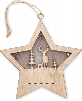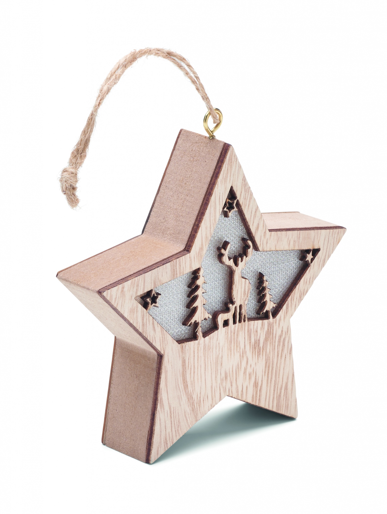 MDF decorated star with light inside with Christmas ornaments and hanging cord. Including 3 LR44 batteries.