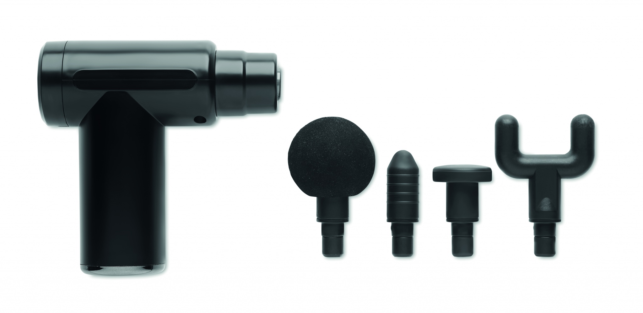 Portable muscle massage device in ABS with 4 interchangeable massage heads. 6 speeds available. Including rechargeable lithium 1200 mAh battery.