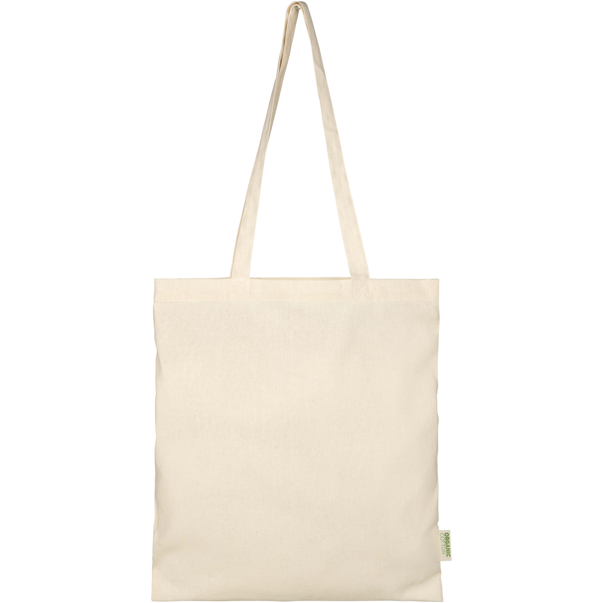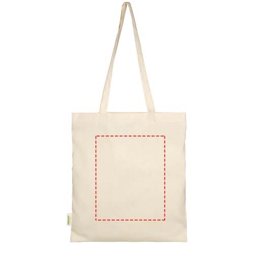 Tote bag made from 100% OCS certified 100 g/m² organic cotton originating from India, featuring a large open main compartment providing plenty of space to carry around all of the essentials. The 32 cm long handles makes it comfortable and easy to carry around wherever you go. Resistance up to 5 kg weight. Volume capacity: 7 litres.