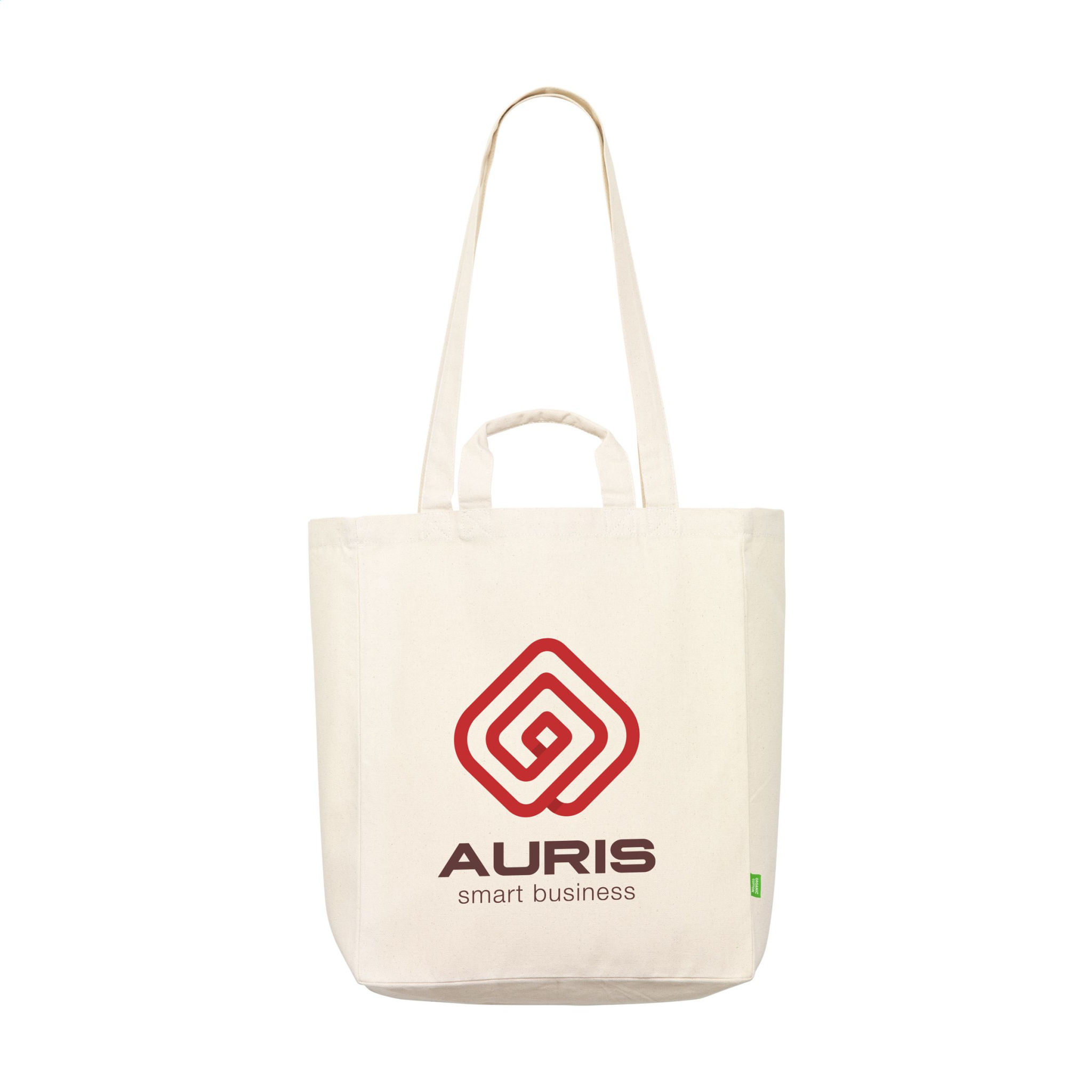 WoW! Sturdy shopping bag made from 100% woven, organic cotton canvas (280 g/m²). This bag has short and long handles and can therefore be carried in several different ways. Also equipped with a small storage compartment on the inside of the bag. Ideal replacement for single-use plastic bags. Capacity approx. 19 litres.