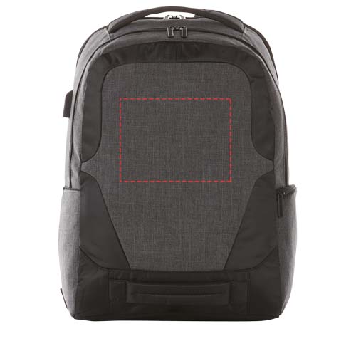 A sleek, 17" laptop backpack with USB port and cable. Equipped with RFID protection in side pocket, additional zippered pockets and a trolley strap on the back. The top and front grab handles and padded shoulder straps make it easy to carry around. There may be minor variations in the colour of the actual product due to the nature of the fabric dyes, weaves, and printing.