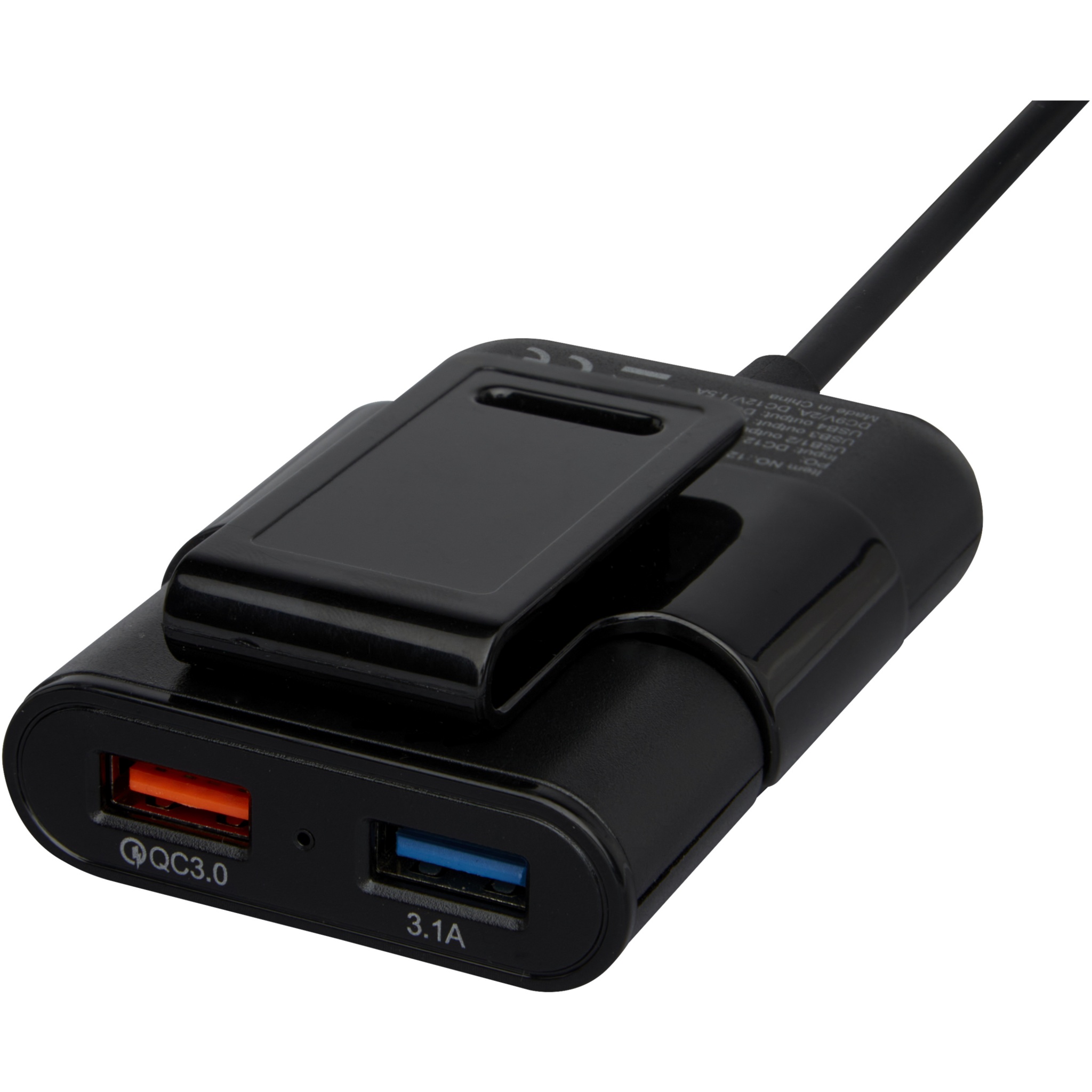 Designed for family & travel, this charger allows back and front seat passengers to simultaneously charge their electronic devices while on the road. Universal compatibility for 12/24V vehicles. Qualcomm Quick Charge Protocol 3.0. USB1/2 output: DC5V/2.4A, USB3 output: DC5V/3.1A, USB4 output: DC5V/3A, DC9V/2A, DC12V/1.5A. Cable length: 170 cm.