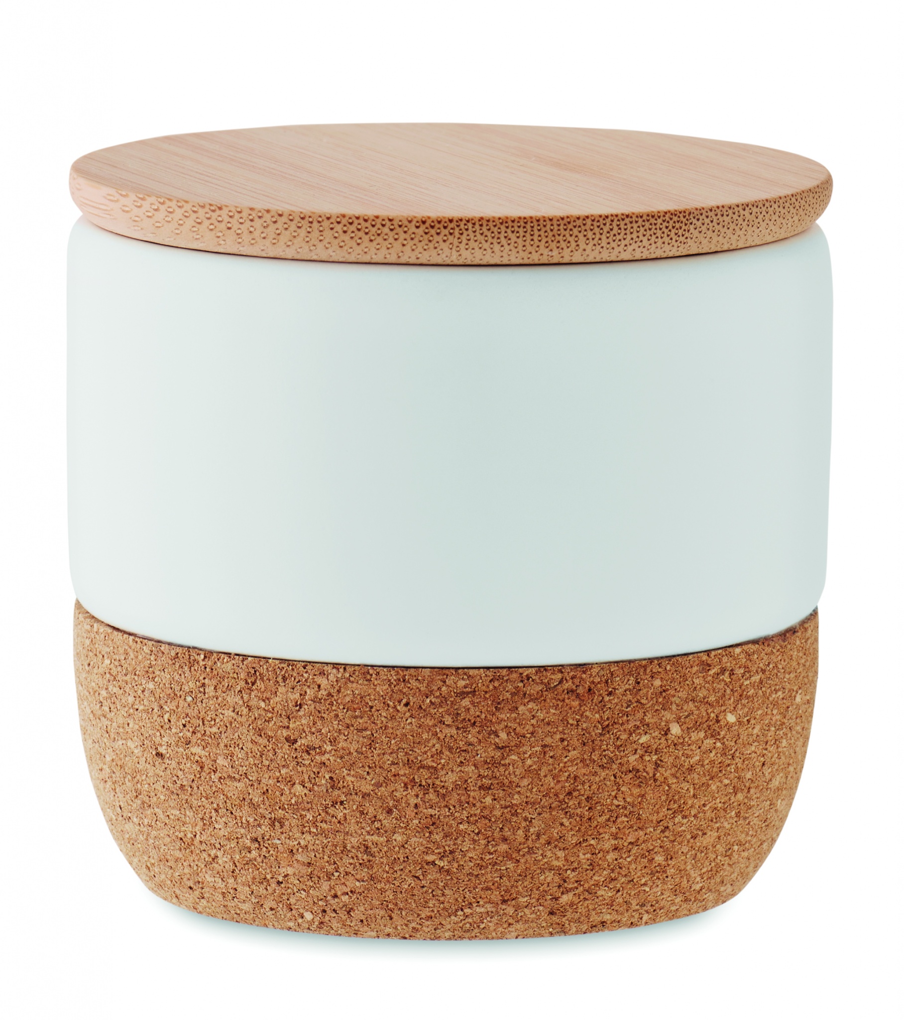 Fresh linen fragranced plant based wax candle in stoneware jar holder with bamboo lid and cork base. 80 gr. Burn time: 7.5 hours. Bamboo is a natural product, there may be slight variations in colour and size per item, which can affect the final decoration outcome.