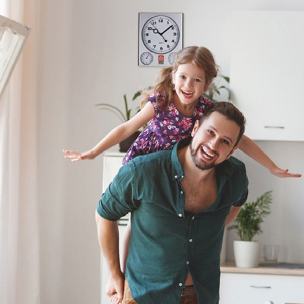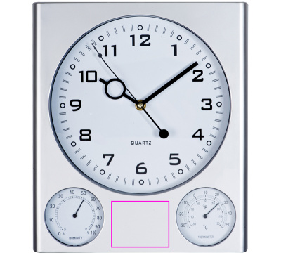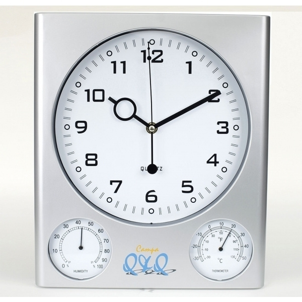 Elegant wall clock with subtle white dial and matt silver surface; displays time, humidity, and temperature. We will print your logo between the hygro and thermometer.