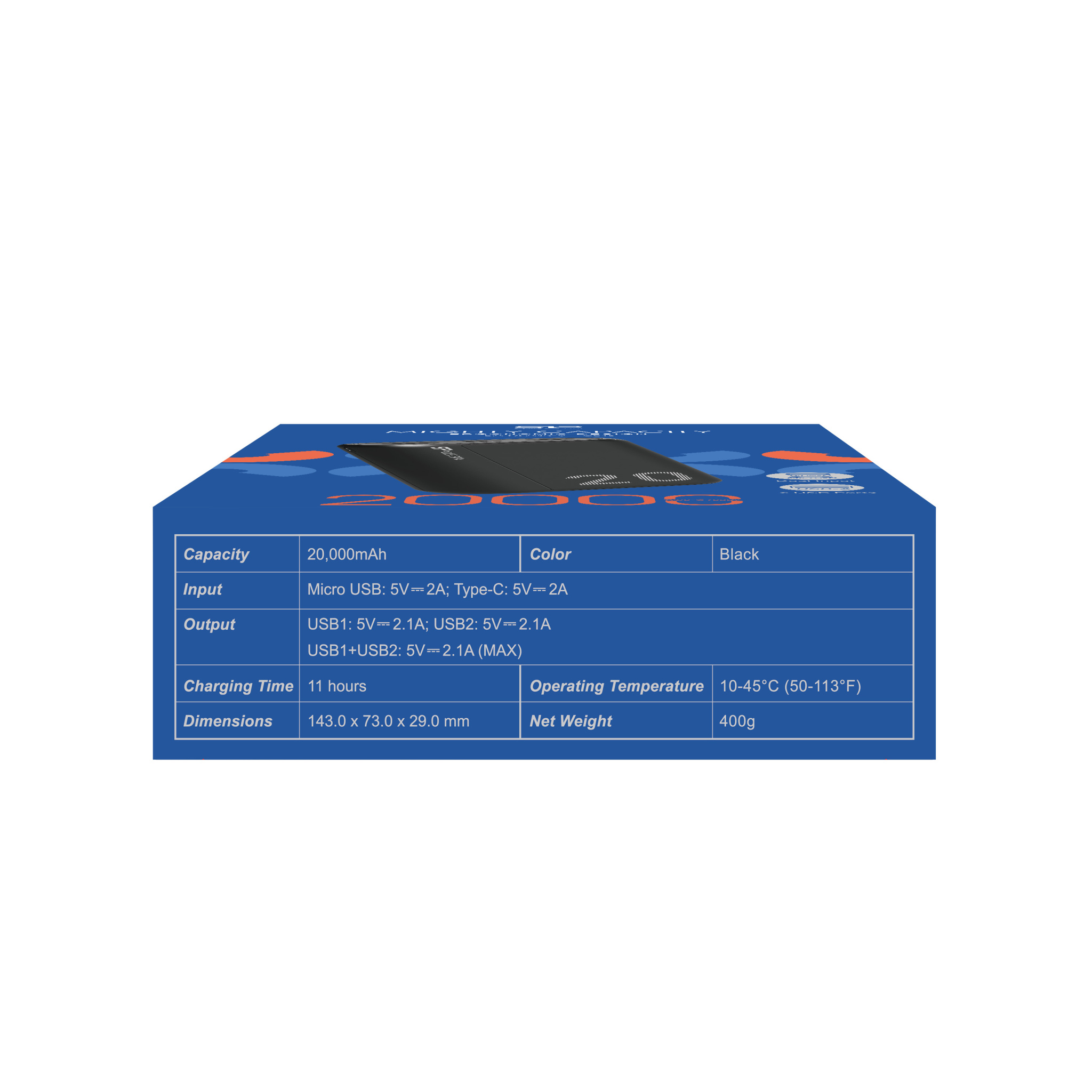 Premium battery cells deliver enough power to recharge just about any smartphone 2-4 full times, for days of power, anywhere. Superior materials within a high-quality construction make it incredibly durable yet comfortable to hold with its ergonomic shape. Specyfication: Dual input Micro-B & Type-C, Dual USB output 2.1A, 20000mAh. Battery: Li-polymer. Color: black