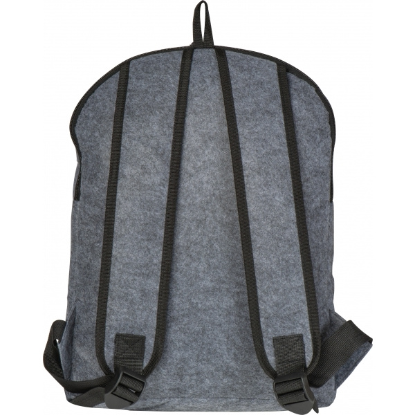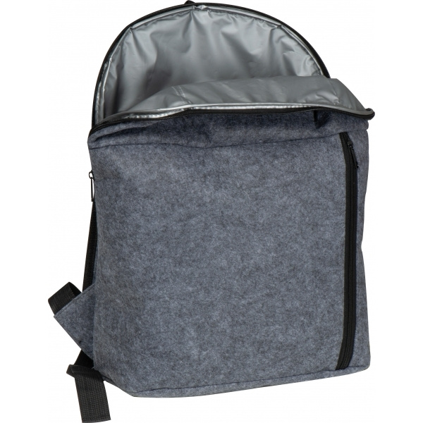 Cooler backpack made of RPET felt. It features padded adjustable shoulder straps and an insulated front pocket with a zipper. Ideal for shopping, picnics, and outdoor adventures.